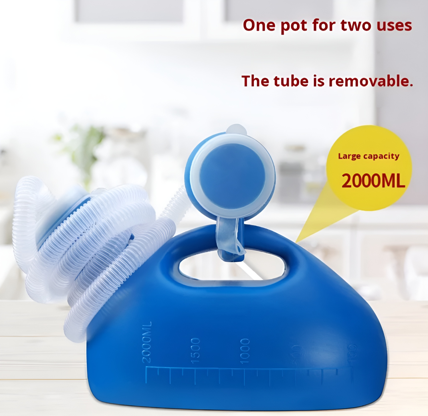 This multi-purpose portable urinal offers a practical and hygienic solution for individuals with limited mobility or those in need of emergency bedside assistance. Its innovative "One Kettle for Two Purposes" design allows for seamless switching between a compact handheld night pot and a bedside system with an extended tube. The large capacity and clear measurement markings ensure accurate monitoring and less frequent emptying.