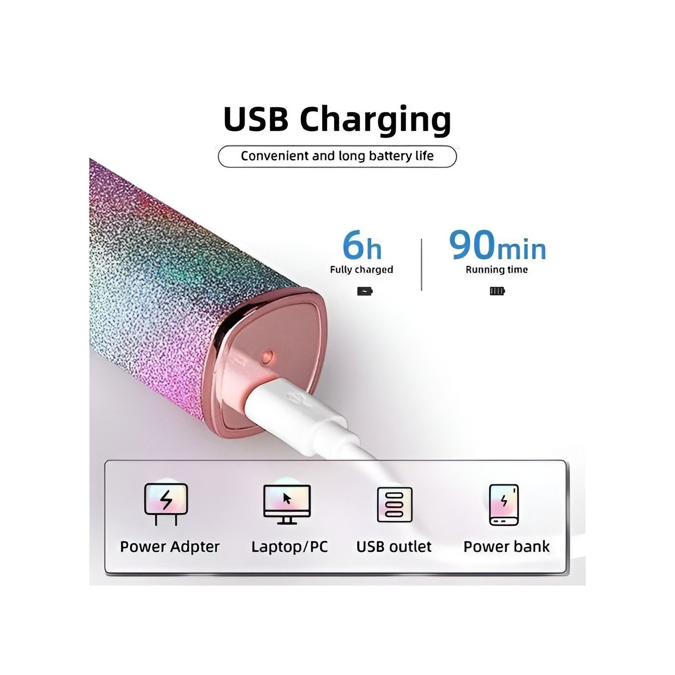 USB Rechargeable with Long Battery Life: Built with a convenient charging system that works via power adapters or laptops and power banks. A full 6-hour charge provides up to 90 minutes of continuous running time for multiple sessions.