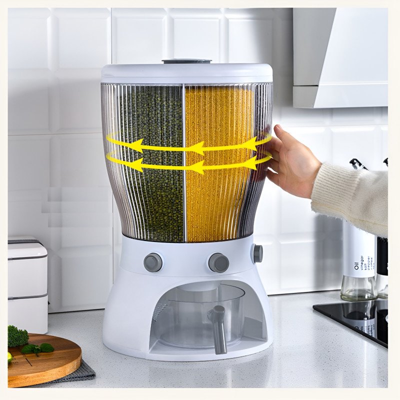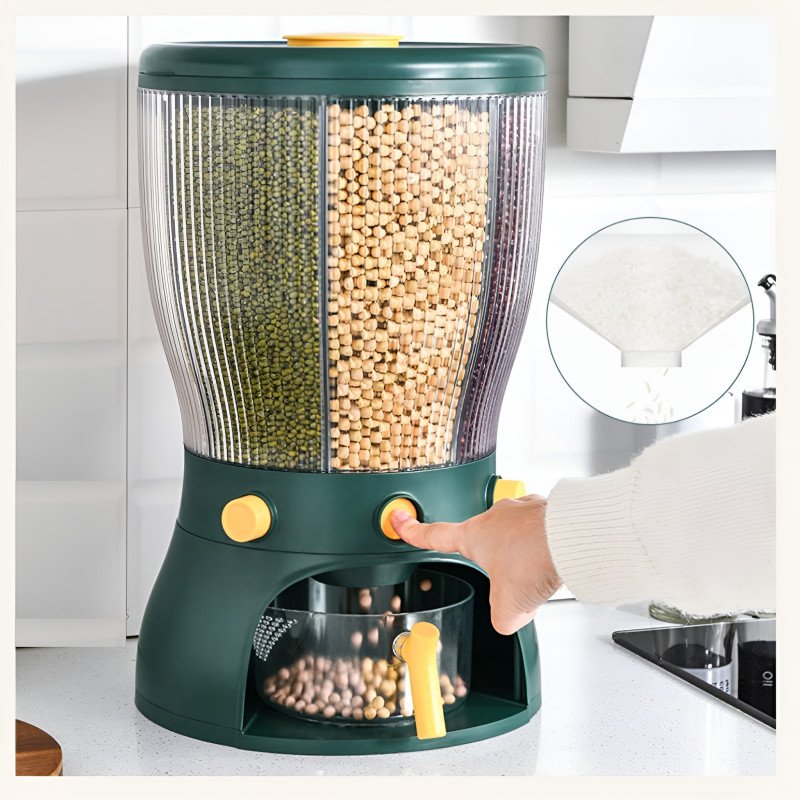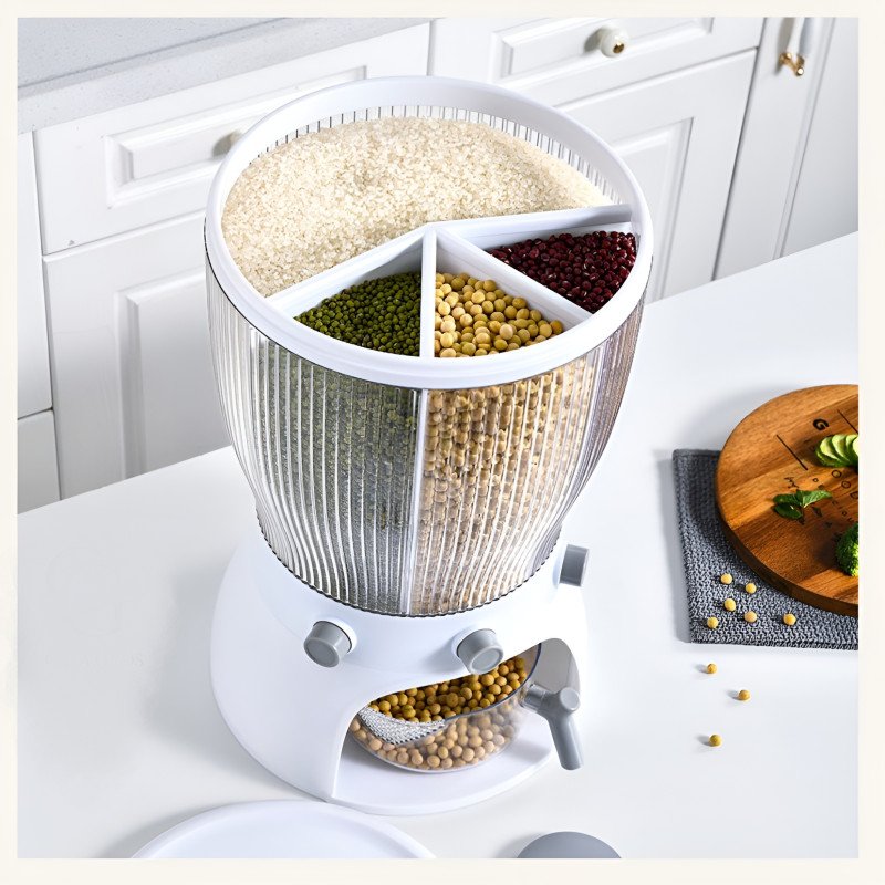 Elevate your kitchen organization with this 360° Rotating 4-Grid Grain Dispenser. Designed for modern homes, this dispenser combines aesthetic appeal with high-tech functionality. It allows you to store a variety of dry foods in one compact station, keeping your countertop clutter-free while ensuring your grains remain fresh, healthy, and easy to access.