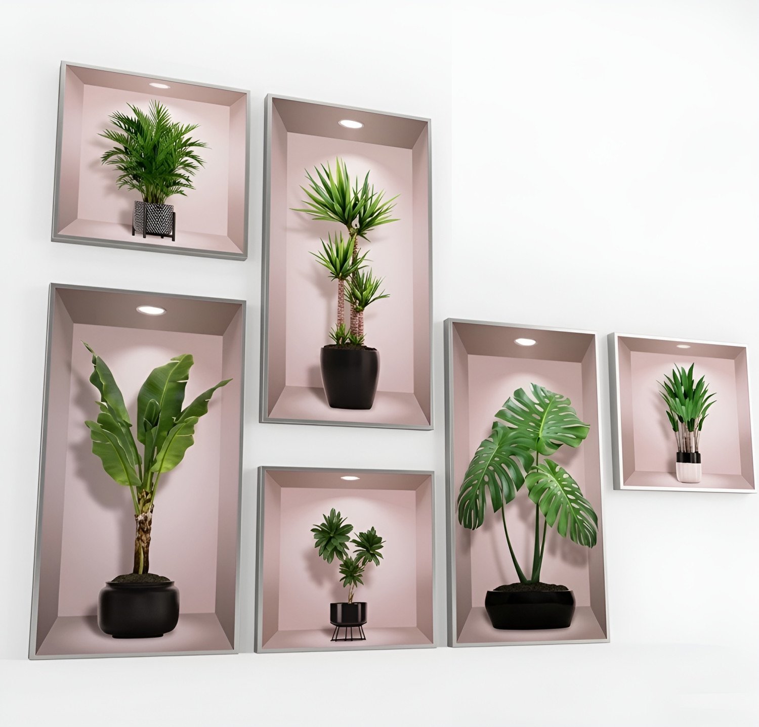 Transform your living space with these innovative 3D plant wall stickers. Designed to create a stunning visual illusion, these decals mimic the appearance of recessed wall niches with built-in spotlights, showcasing vibrant indoor plants. It is the perfect way to add a touch of nature and architectural depth to any room without the need for actual renovations or plant maintenance.