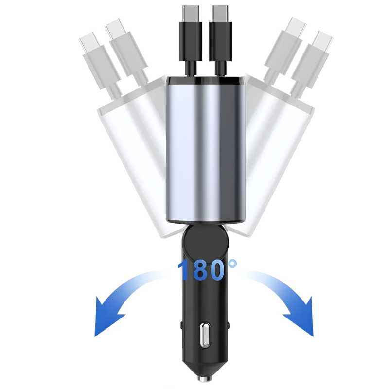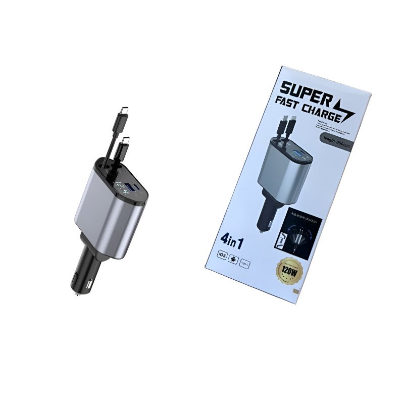 Upgrade your driving experience with the 4-in-1 Super Fast Charge Car Charger. This heavy-duty 120W power adapter is designed to eliminate cable clutter in your car while providing lightning-fast charging for your smartphones, tablets, and more. Featuring a unique 180° adjustable swivel design, it fits perfectly in any vehicle layout, ensuring comfort and accessibility while you drive.