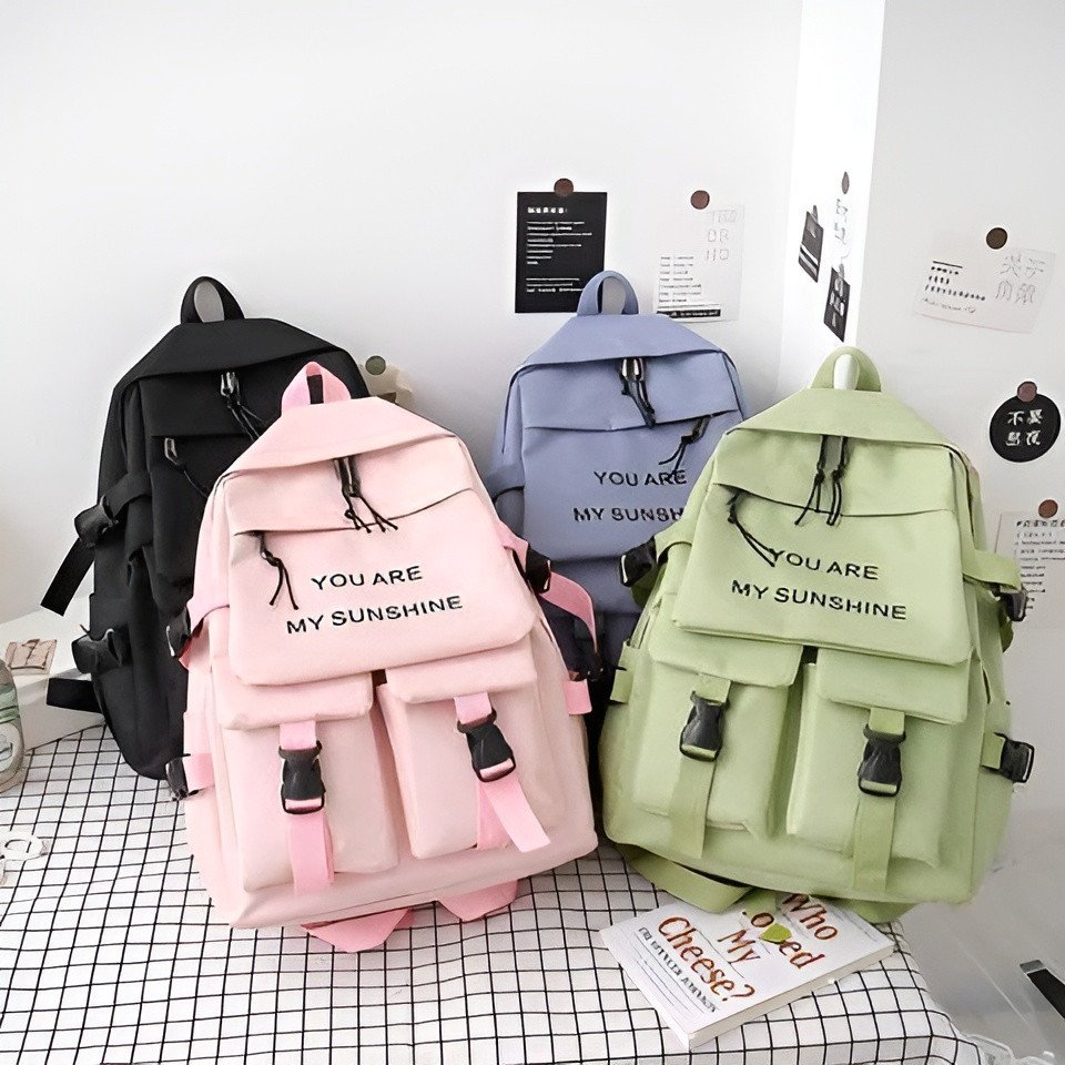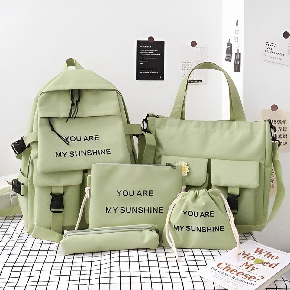 Upgrade your school style with this all-in-one 5-piece backpack set designed for the modern student. This set combines functionality with a trendy aesthetic featuring the inspiring "You Are My Sunshine" slogan. Crafted from high-quality canvas, it provides a complete solution for carrying everything from heavy textbooks to small stationery items in a coordinated and stylish way.