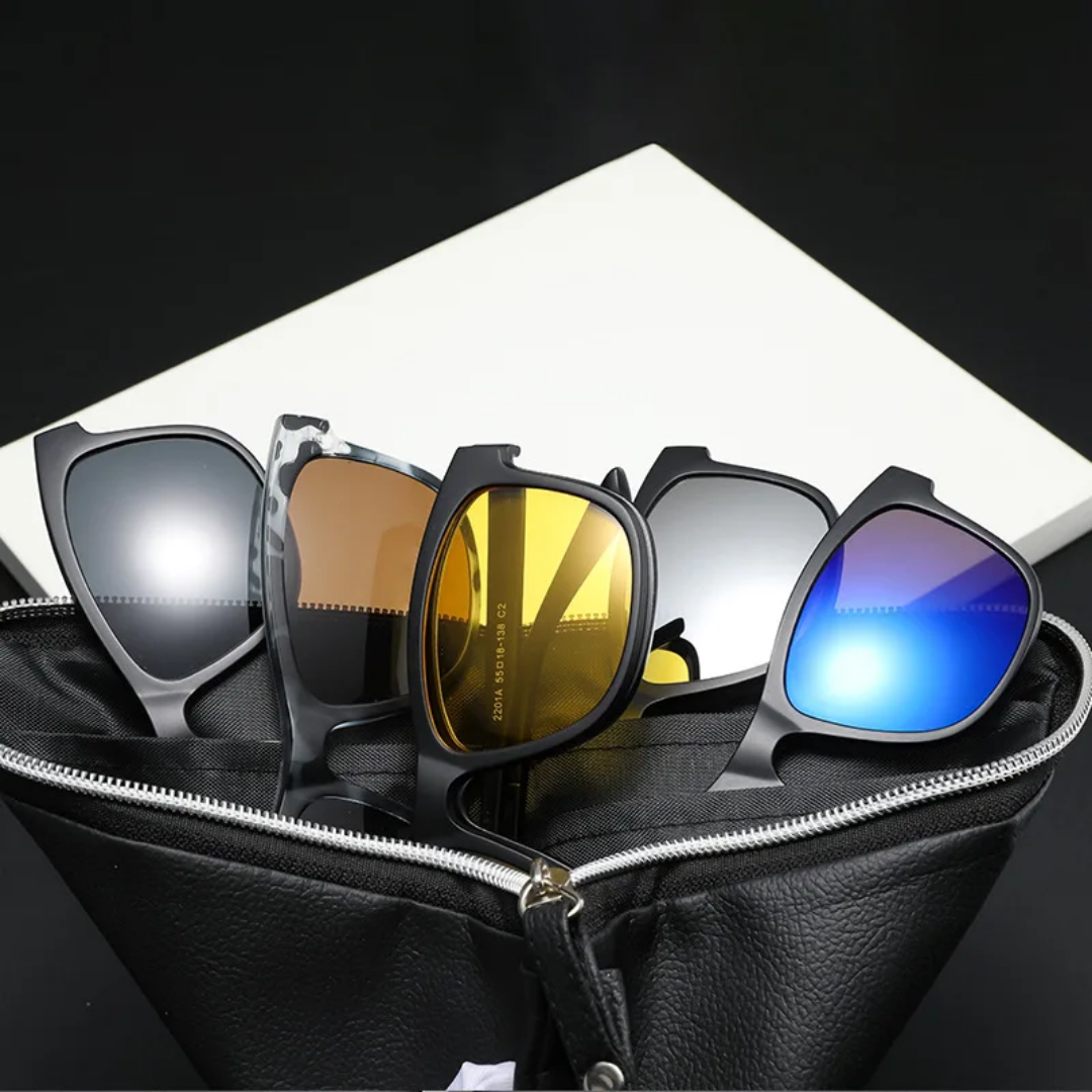 Experience ultimate versatility with the 6-in-1 Magnetic Clip-On Sunglasses Set. This professional eyewear system allows you to switch your look and protection in seconds. The set includes a sturdy optical frame that can be fitted with prescription lenses, along with 5 magnetic clip-on lenses designed for every scenario—from bright sunlight to night driving.