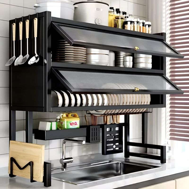 This organizer is the ultimate solution for small kitchens or for anyone seeking professional-grade organization. It combines a drying rack, a storage cabinet, and a tool organizer into one sleek unit. By freeing up your counter space and protecting your dishes within enclosed cabinets, it ensures a cleaner, more efficient, and modern cooking environment.