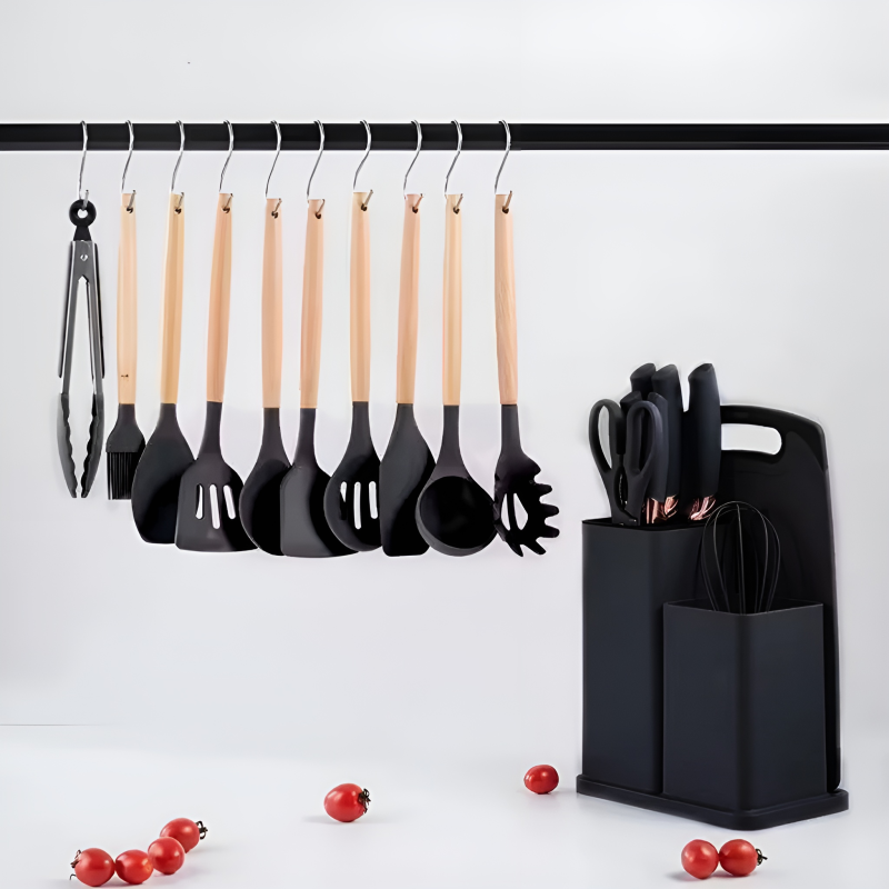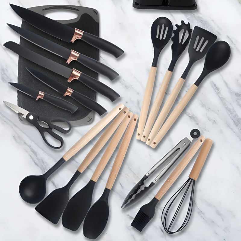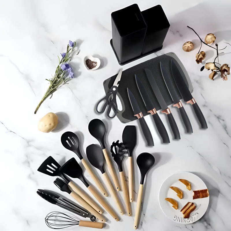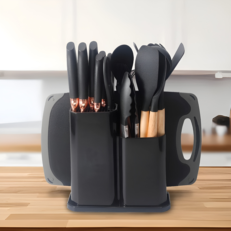 Elevate your culinary experience with this premium all-in-one kitchen set designed for modern homes. This comprehensive collection combines essential silicone cooking tools with a high-quality knife set and a matching cutting board, all neatly housed in a sleek space-saving organizer. It is the perfect blend of functionality and aesthetic appeal, bringing a touch of professional elegance to your countertop.