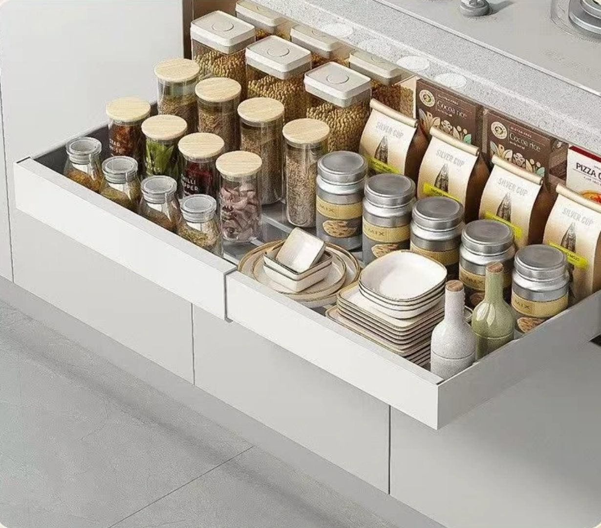 This organizer is the ultimate solution for optimizing vertical and deep storage spaces. It reduces physical strain by bringing the contents of the cabinet to you, protects your items from clutter-related damage, and adds a modern, high-end feel to your kitchen or bathroom shelving.