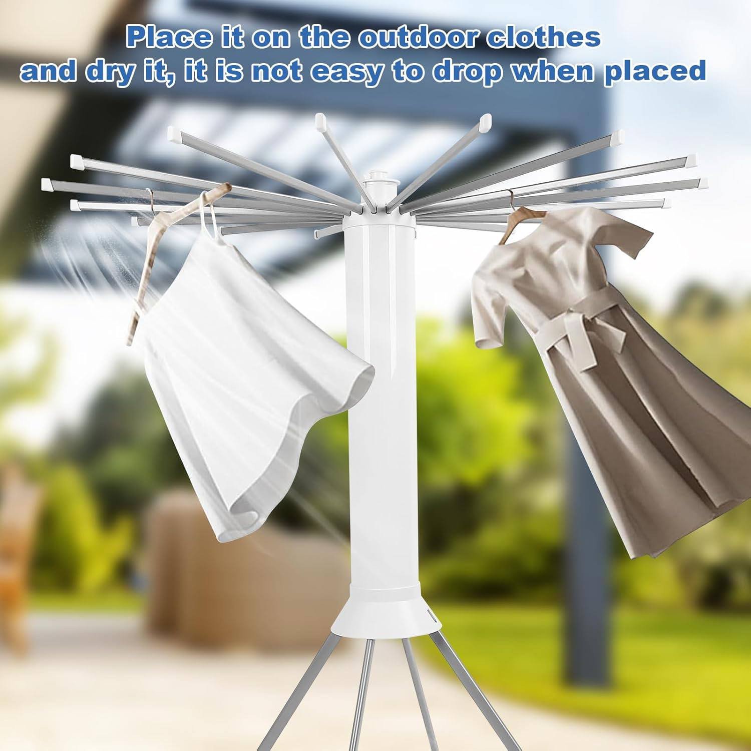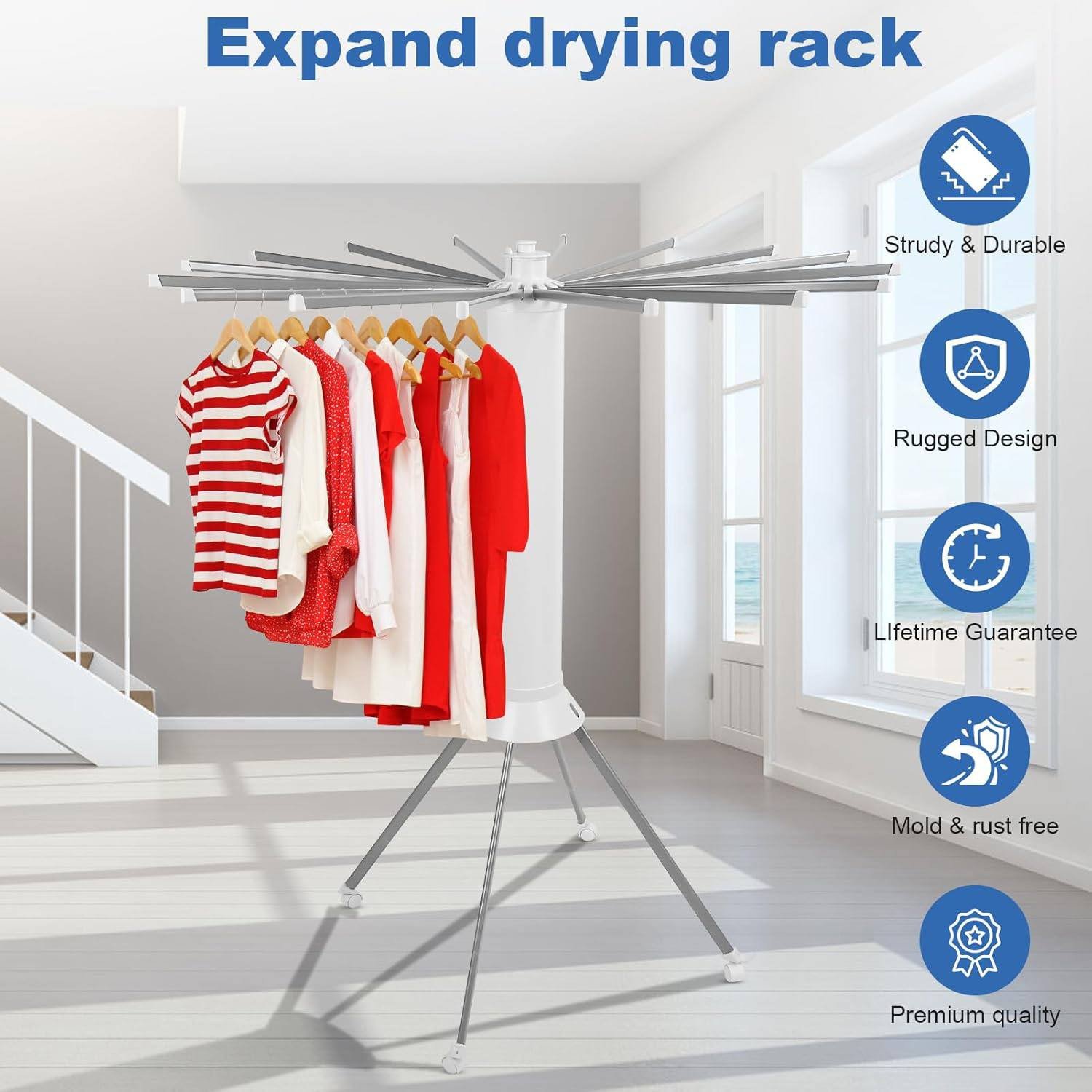This drying rack is the ultimate solution for households that demand efficiency and durability. Unlike traditional flat racks, its vertical rotary design occupies minimal floor space while providing maximum hanging area. It eliminates the struggle of moving heavy laundry thanks to its mobile wheels and ensures your clothes remain in perfect shape with its anti-bending hangers. Compact, sturdy, and highly mobile, it is the best investment for an organized and efficient laundry day.
