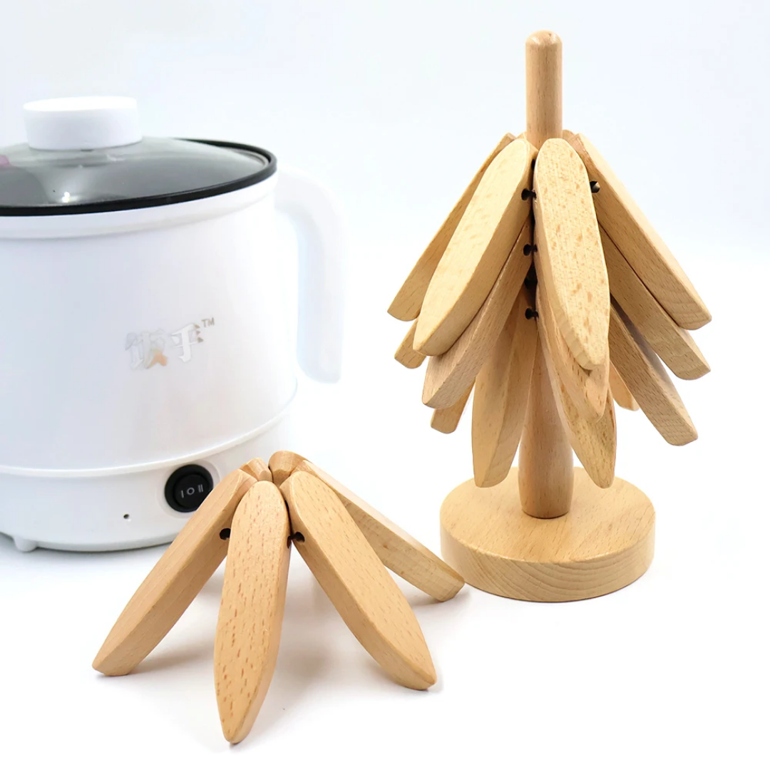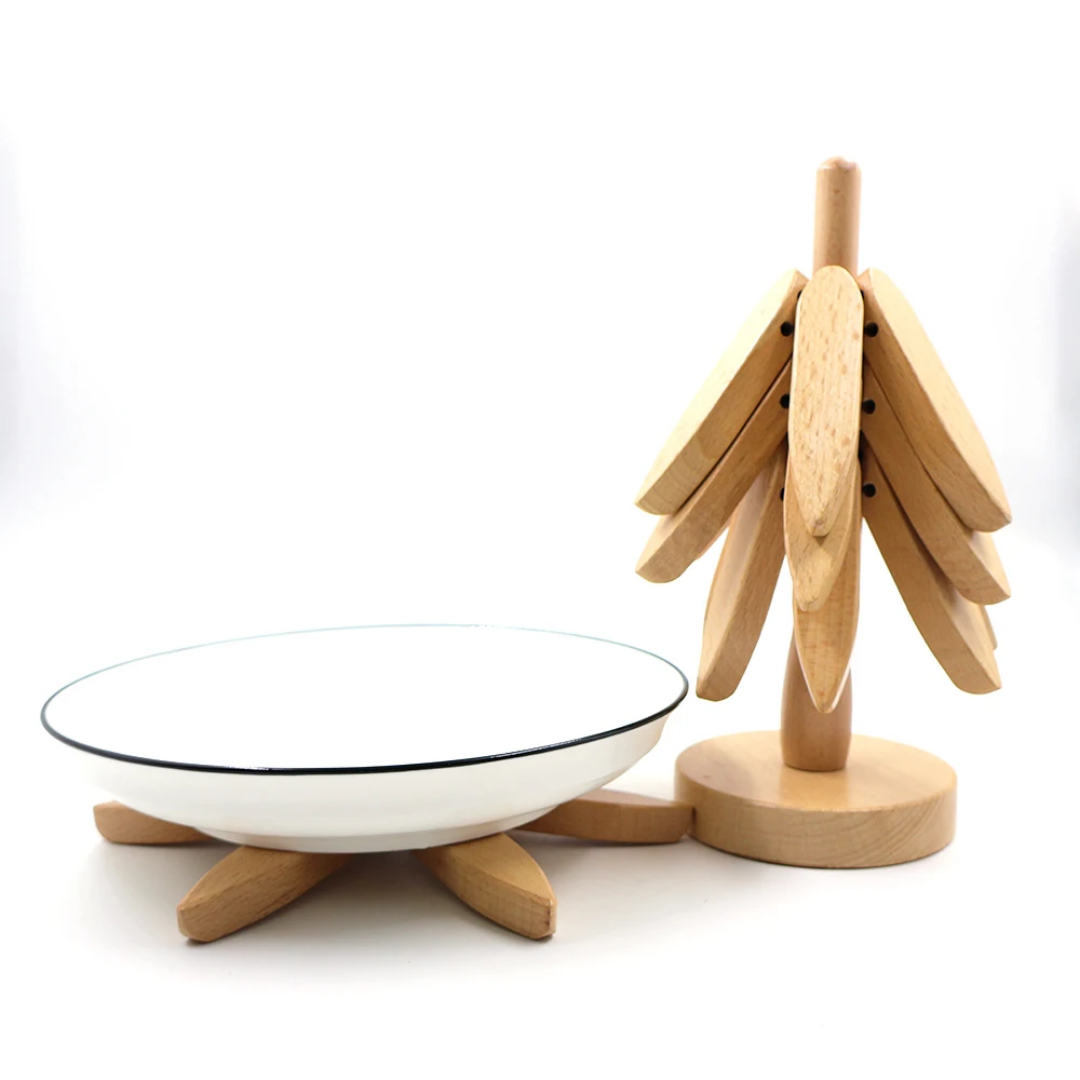 - Vertical Space Saving Stand: Comes with a sleek vertical wooden holder that stores the trivets like branches on a tree, saving valuable countertop space.