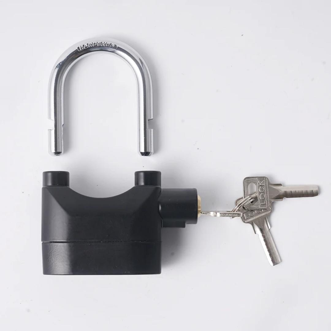 Secure your valuable assets with this heavy-duty siren alarm padlock. Designed to provide a high level of security, this lock features a dual-function system that works as a traditional high-security padlock or as a loud 110dB siren alarm that triggers upon vibration or movement. It is the perfect deterrent for thieves, making it ideal for motorcycles, bicycles, gates, and storage units.