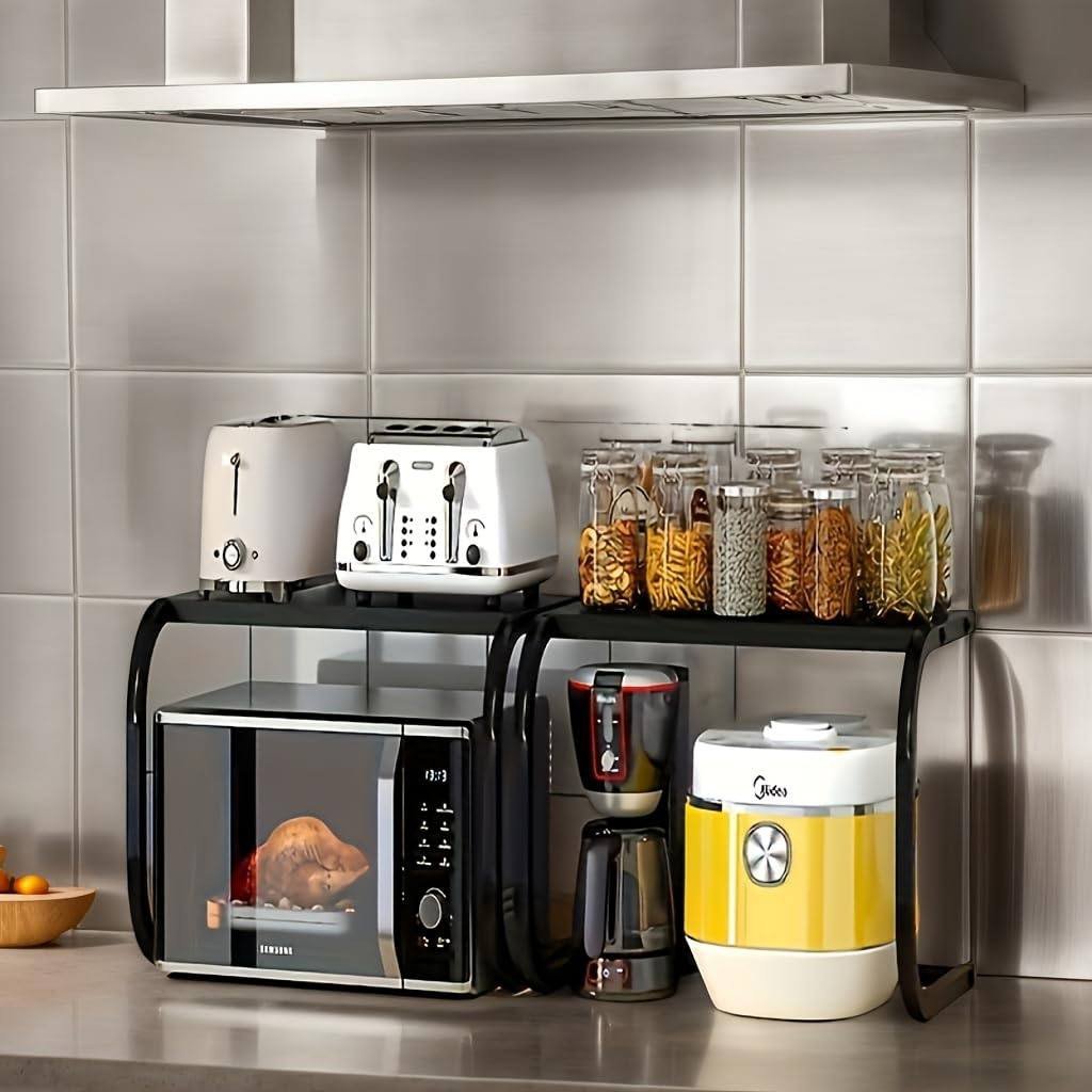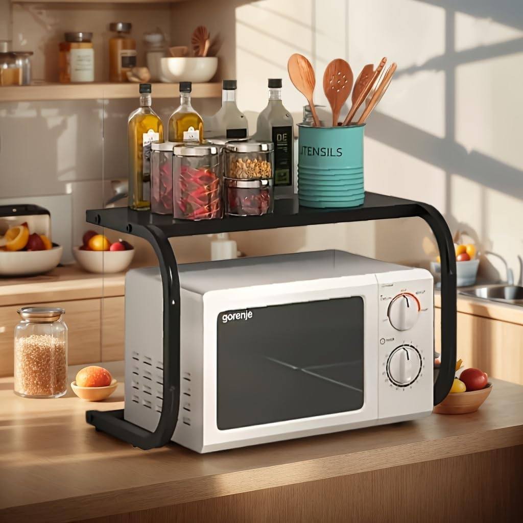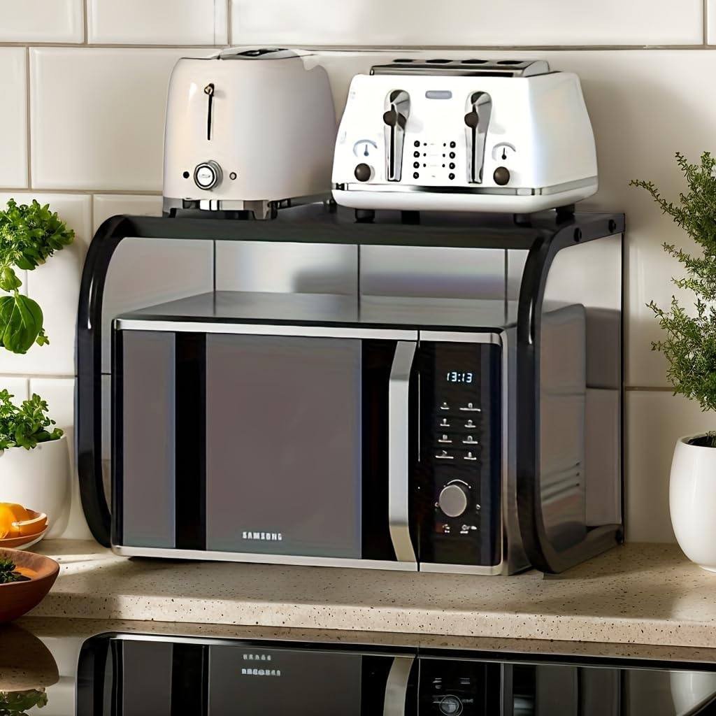 This microwave rack is the ultimate solution for small kitchens or for anyone looking to optimize their countertop organization. Unlike standard shelves, its specialized design for heat dissipation makes it safe for use over appliances. It is a durable, stylish, and practical tool that doubles your storage capacity instantly.
