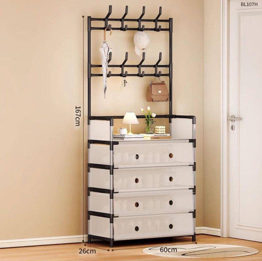 The Integrated 4-Tier Shoe Cabinet and Clothing Organizer for Space Saving is the ultimate organization tool for modern living. It eliminates the daily stress of searching for lost keys or tripping over scattered shoes by gathering all your exit essentials into one stylish unit. It is an investment in your home's efficiency that keeps your private space looking organized and beautiful.