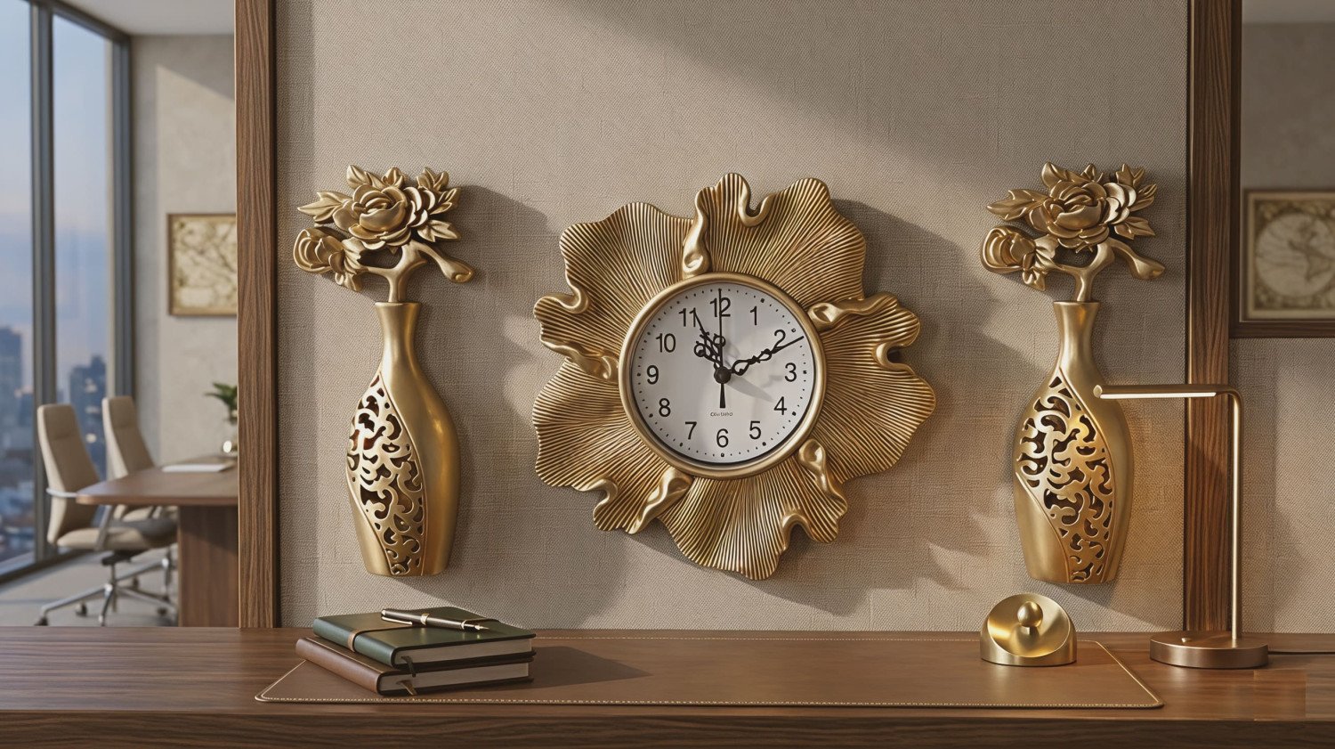 Transform your living space into a gallery of elegance with this exquisite three-piece golden wall decor set. This set features a stunning artistic wall clock flanked by two matching decorative wall-mounted vases, all finished in a brilliant gold that radiates luxury. Designed for those who appreciate fine details, this ensemble serves as both a functional timepiece and a sophisticated art installation for any modern or classic home.