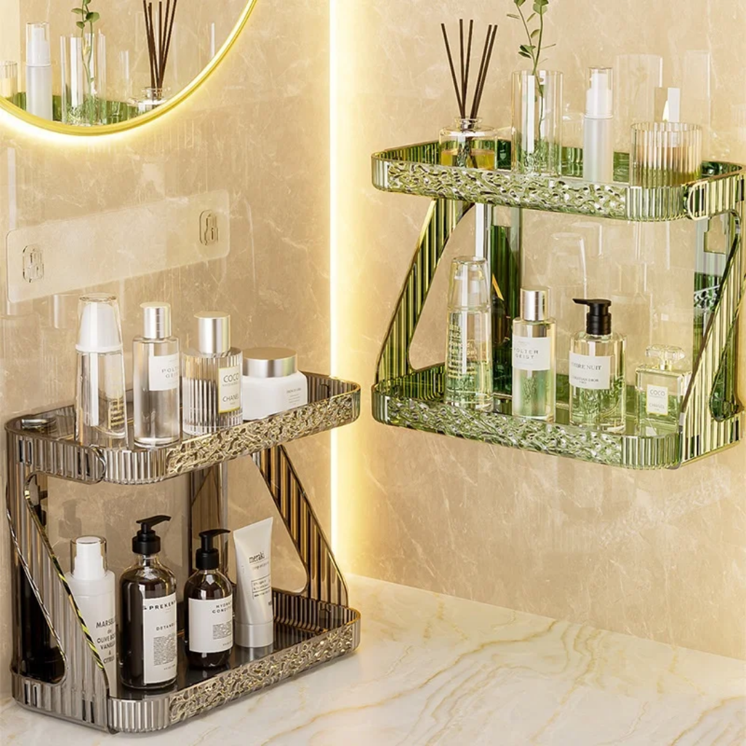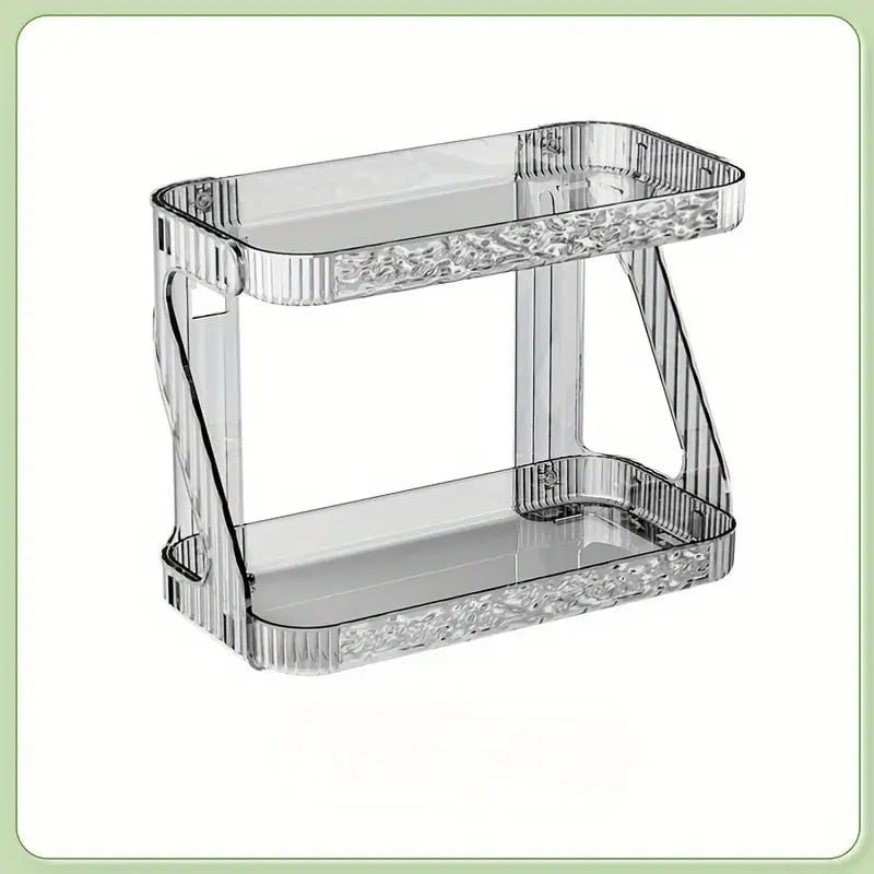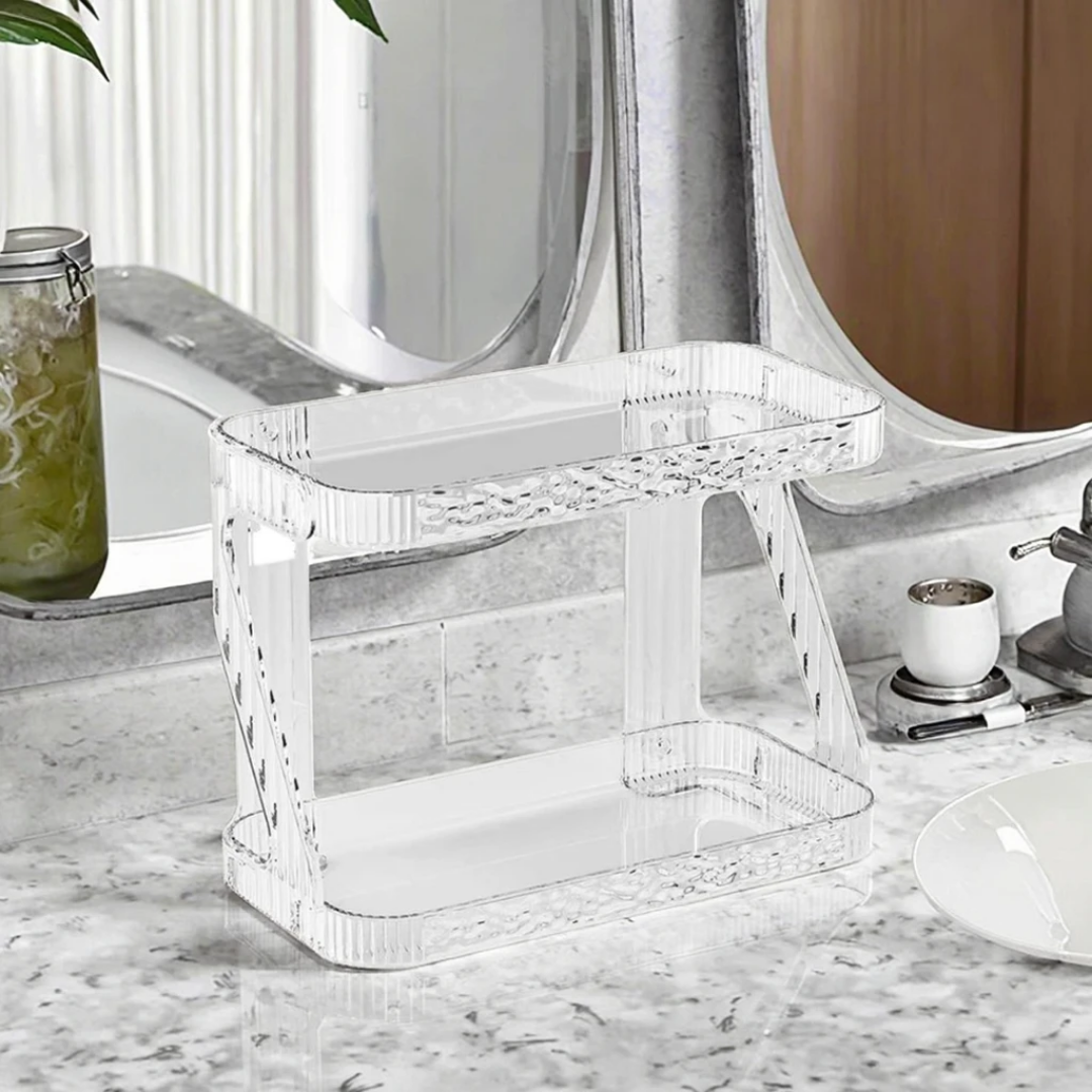 Elevate your home organization with this elegant double-layer storage rack. Featuring a modern wavy texture and a crystal-clear finish, this versatile organizer combines functionality with high-end aesthetics. Whether placed on a countertop or mounted on a wall, its transparent design adds a touch of sophistication to any room while keeping your essentials perfectly arranged and within reach.