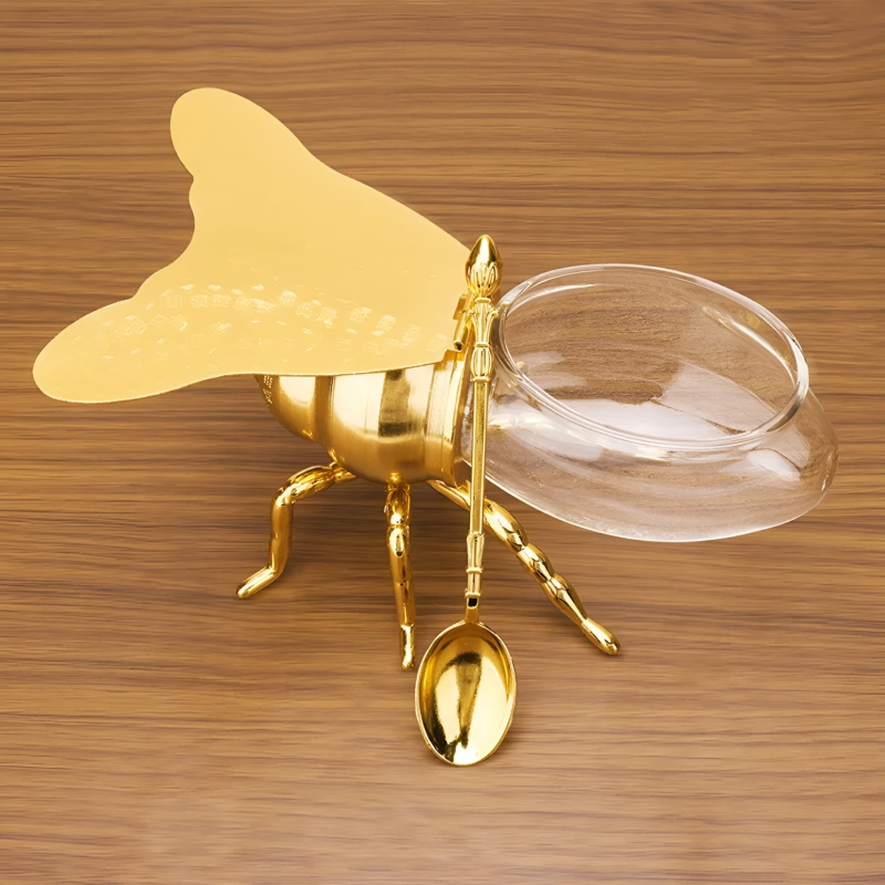 This luxury bee-shaped jar is a specialized piece of tableware designed for serving spices and condiments with elegance. The metallic body is crafted with high-quality gold plating, featuring detailed wings that function as a hinged lid to protect the contents. It serves as a sophisticated addition to dining settings, combining artistic craftsmanship with practical kitchen utility.