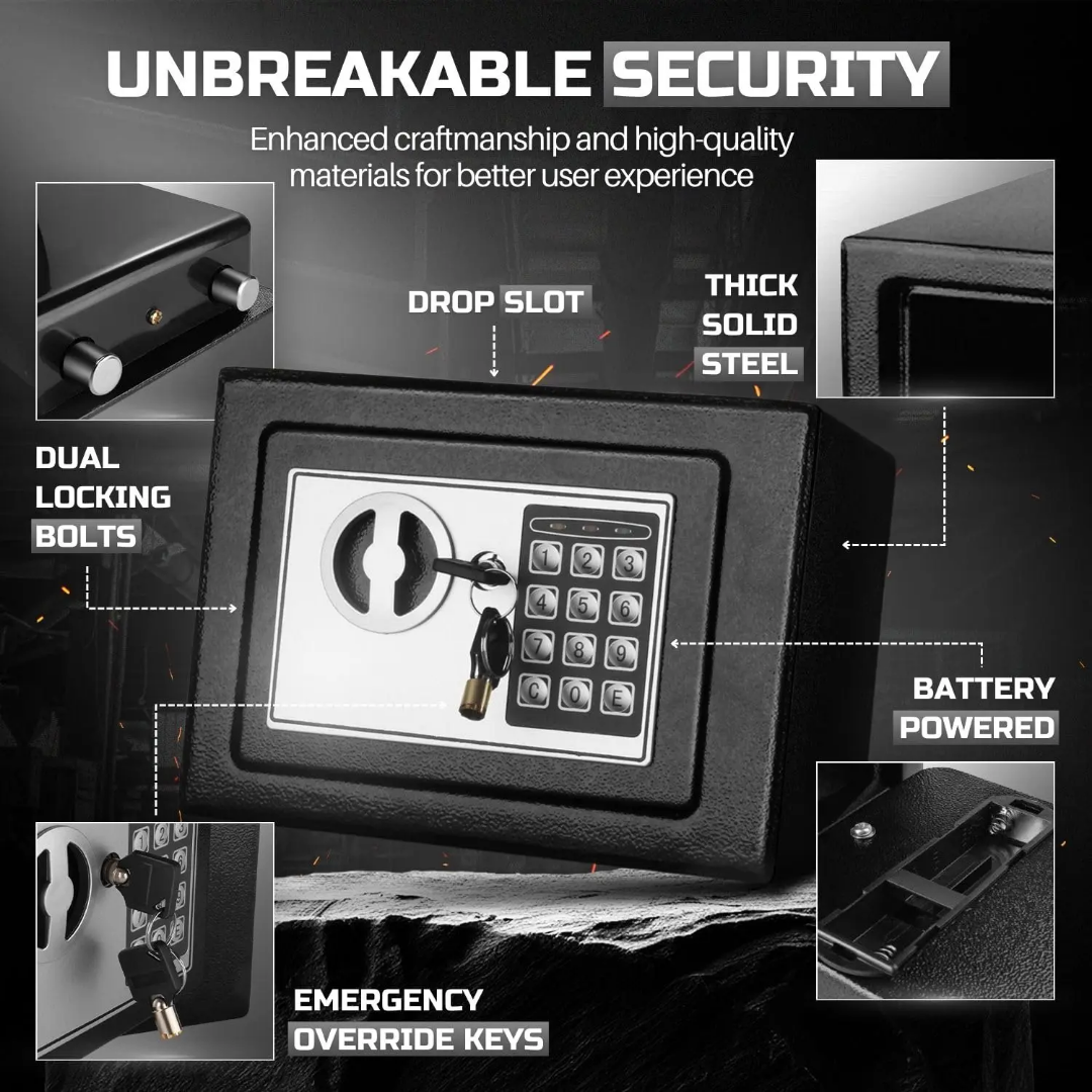 Ensure the ultimate protection for your most valuable possessions with this Digital Security Safe. Designed for both home and office use, this compact vault provides a secure sanctuary for your cash, jewelry, passports, and essential documents. Its robust construction and smart locking system offer peace of mind, knowing your valuables are protected from unauthorized access.