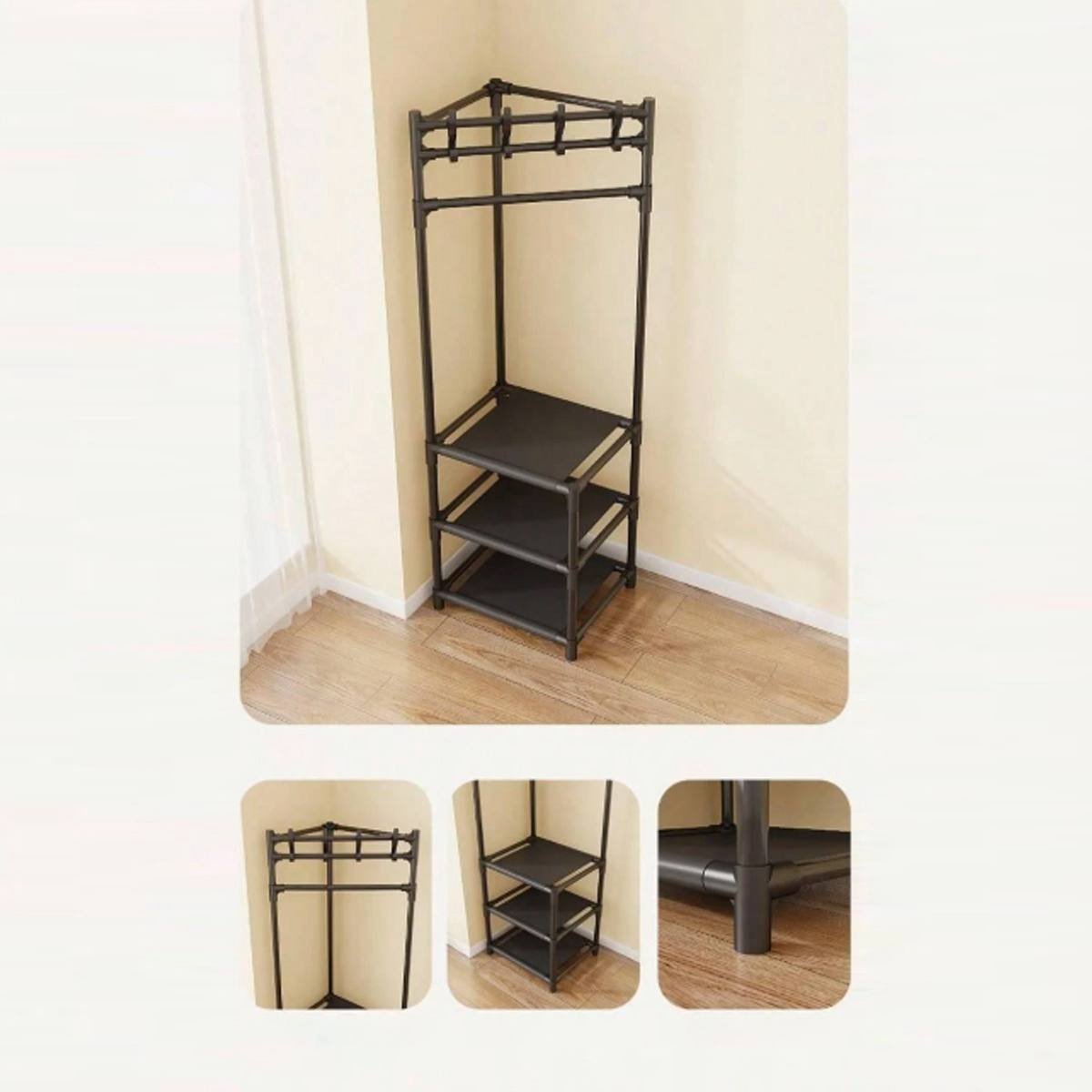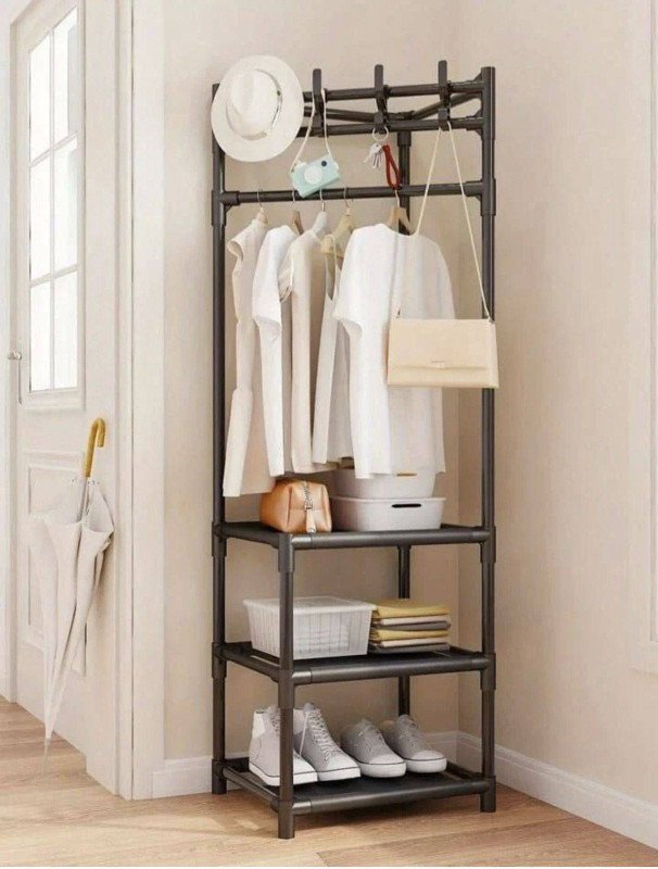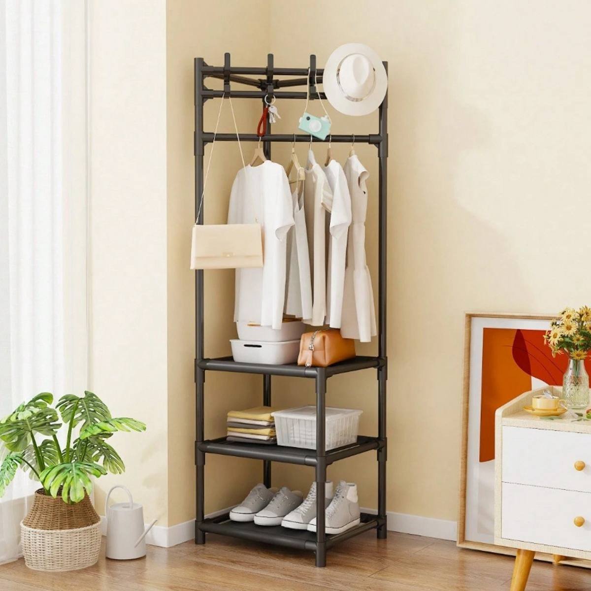Keep your entryway or bedroom organized and stylish with this all-in-one vertical organizer. This rack is the perfect solution for compact living, providing a dedicated spot for everything from daily coats and bags to your favorite shoes, all in one sturdy, space-efficient piece.