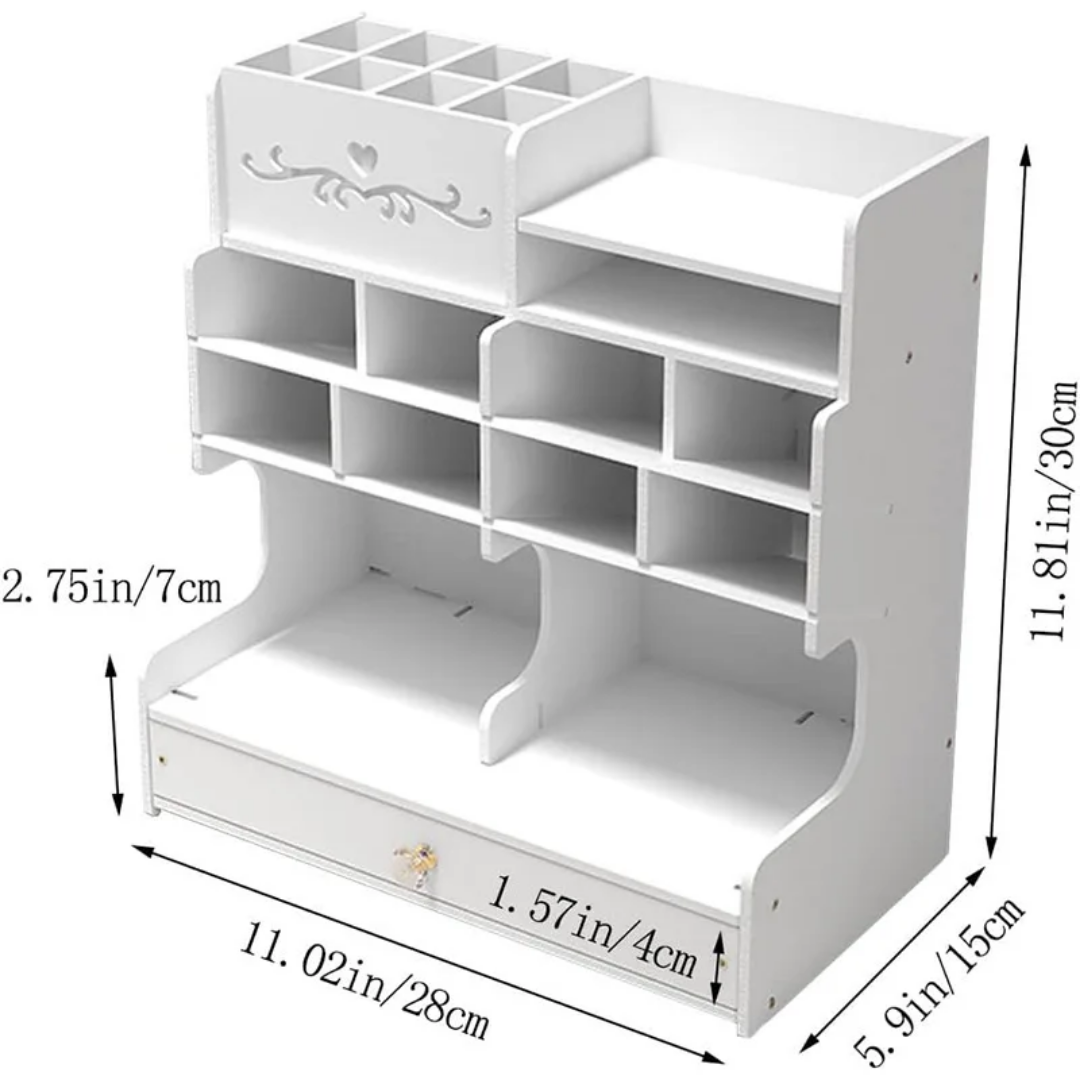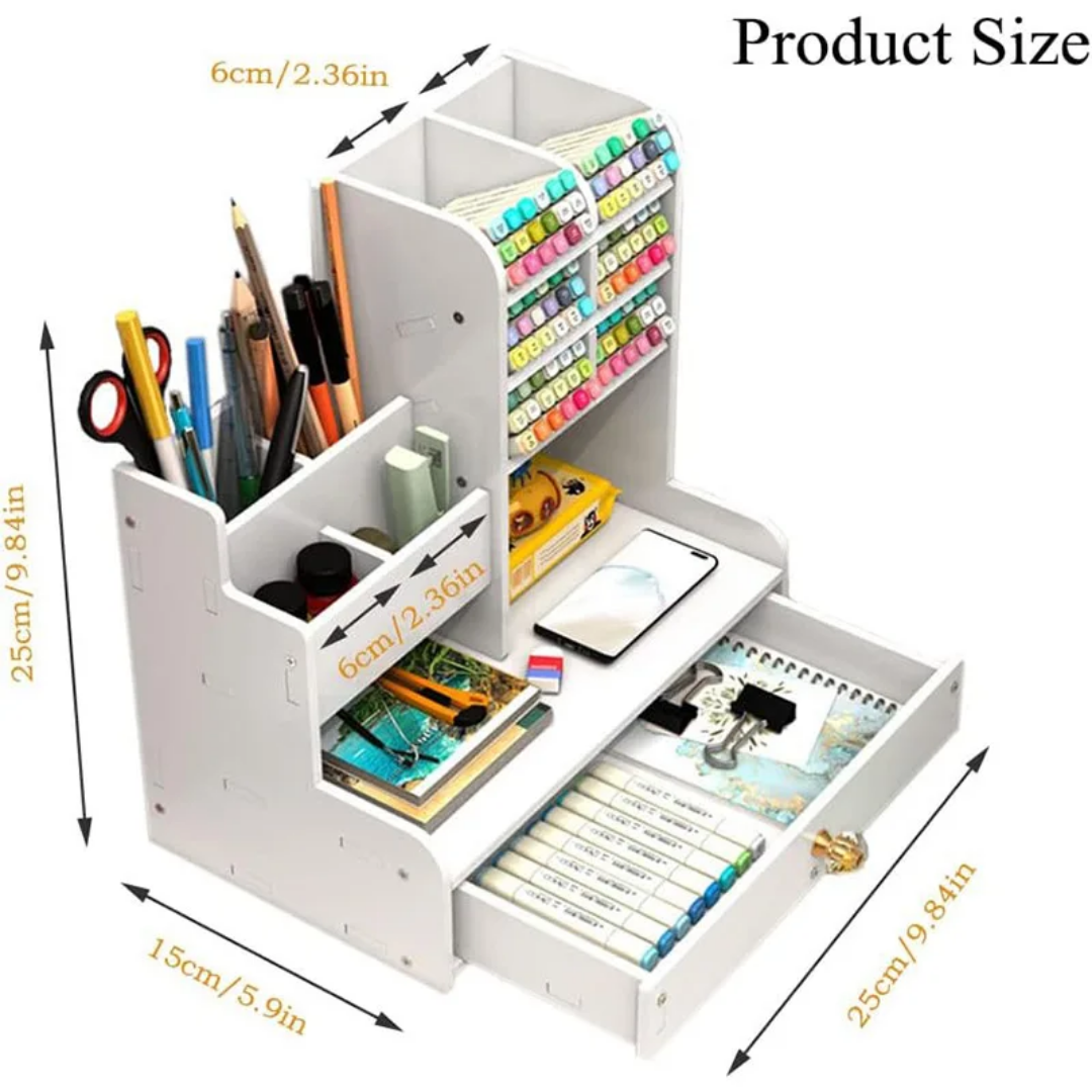 Transform your workspace into a model of efficiency and style with this Multi-Functional Wooden Desktop Organizer. This all-in-one storage solution is designed to declutter your desk by providing a dedicated home for everything from markers and pens to notebooks and smartphones. Its clever vertical design and elegant white finish make it an essential addition to any student's desk, artist's studio, or professional office, ensuring your creative tools are always within reach.