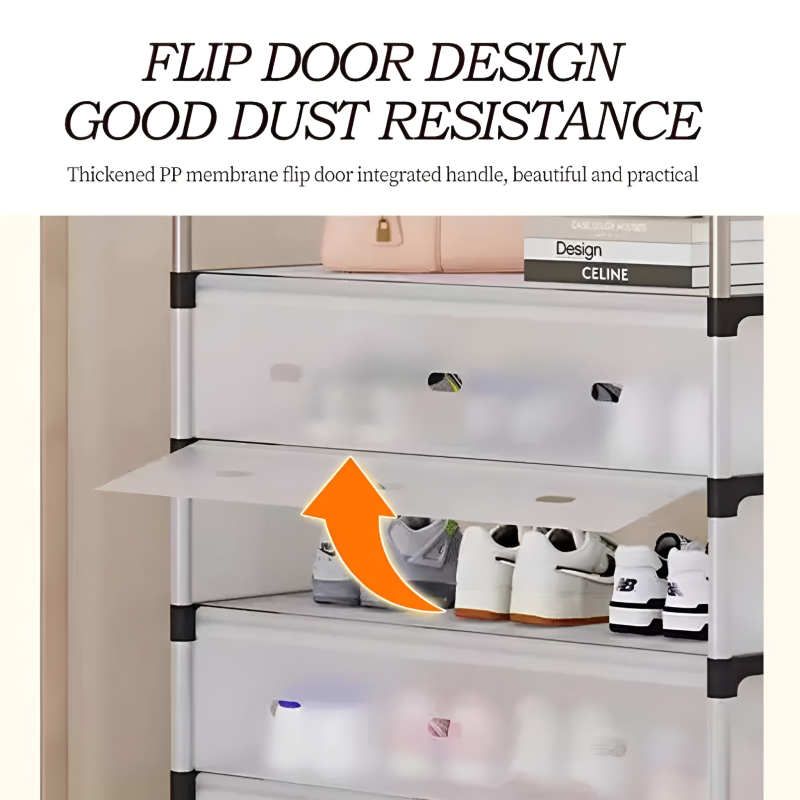 Declutter your entryway with this Multi-Tier Modern Shoe Rack Organizer. Featuring a sleek vertical design, this cabinet provides ample storage for your entire shoe collection without taking up much floor space. The translucent, dust-proof panels keep your shoes hidden for a neat appearance while still allowing you to easily locate your favorite pair.