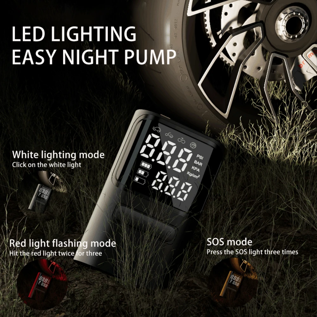 Ensure your tires are always at the perfect pressure with this Portable Electric Air Compressor. This smart, compact device is designed for ultimate versatility, capable of inflating car tires, motorcycles, bicycles, and sports equipment like basketballs with ease. Featuring a high-precision digital display and an integrated LED light, it provides a reliable solution for roadside emergencies or routine maintenance, anytime and anywhere.