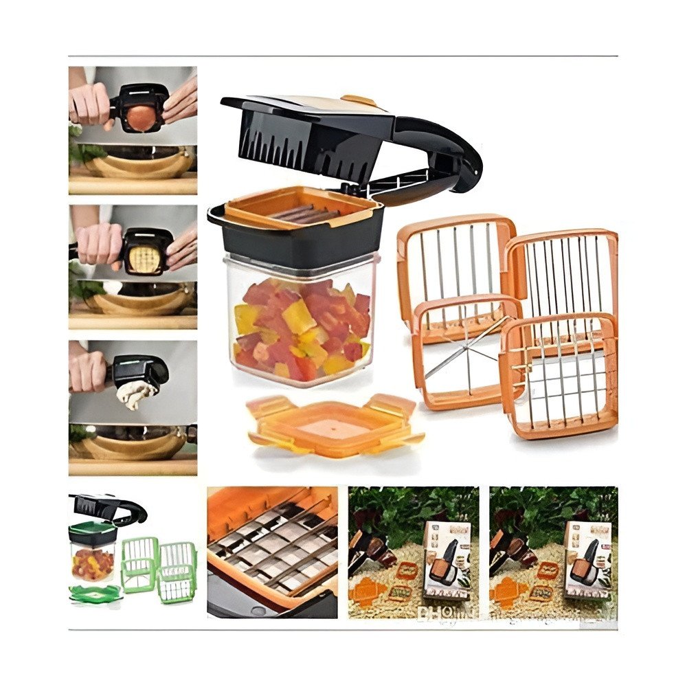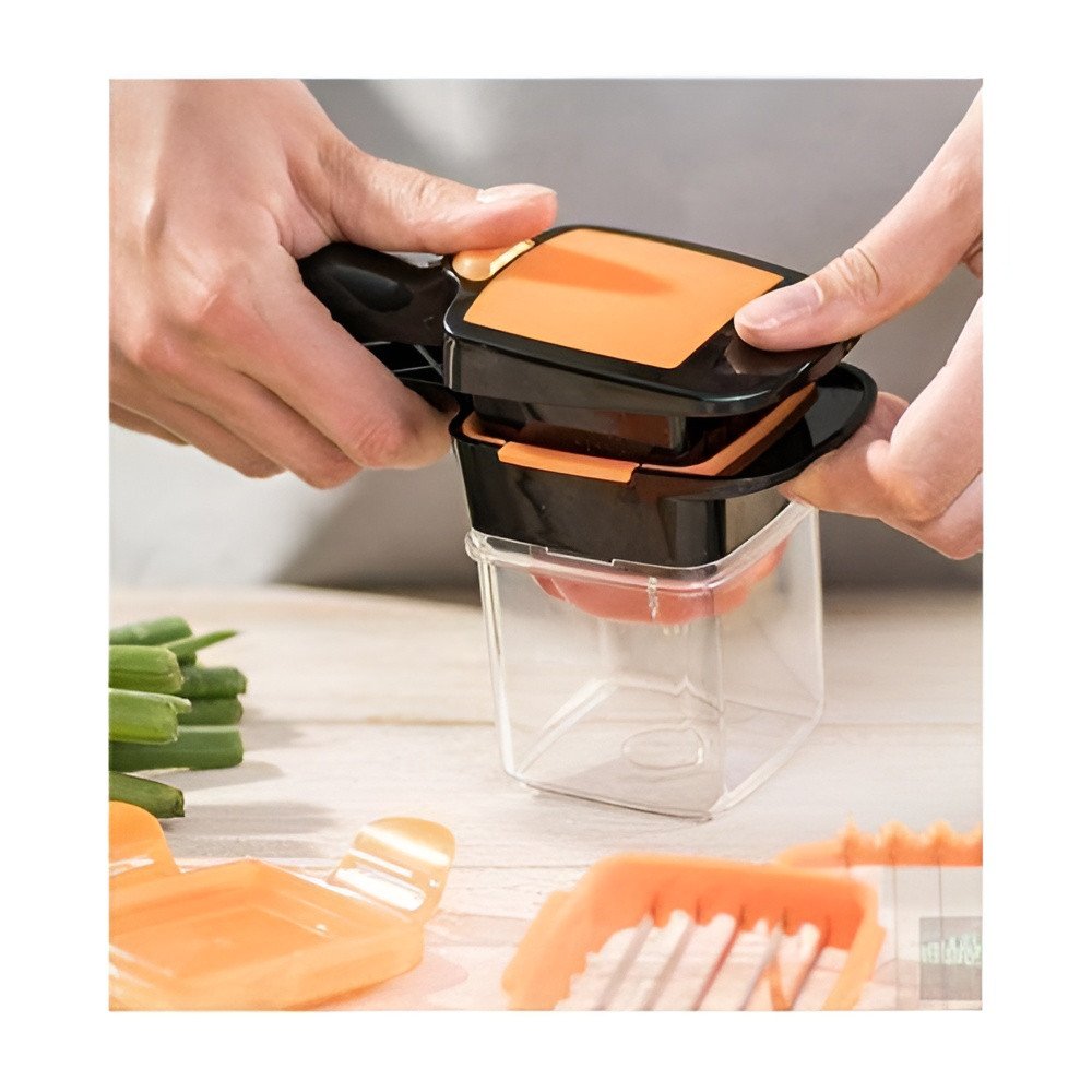 Simplify your meal preparation and save valuable time with the Quick-Press Multi-Blade Vegetable Slicer. This versatile 5-in-1 tool is meticulously designed to provide uniform cuts for a variety of foods. It allows you to transform whole vegetables and fruits into professional-looking slices or cubes in seconds with a simple handheld press.