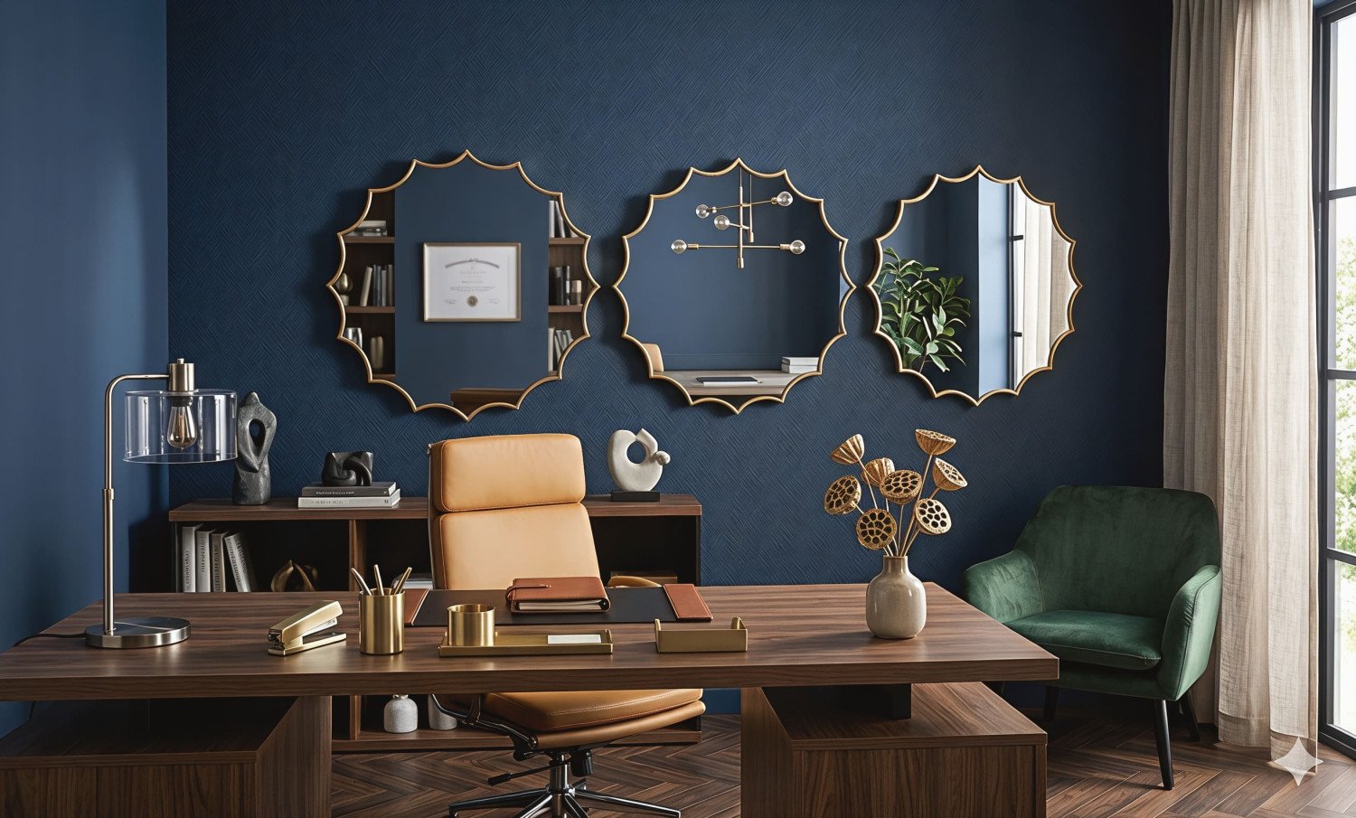 Elevate the aesthetic of your living space with this exquisite set of three decorative wall mirrors. Each piece features a stunning golden frame with a unique starburst or scalloped edge design that blends modern flair with classic elegance. These mirrors are designed to be more than just functional items; they are artistic statements that reflect light and style throughout your home.