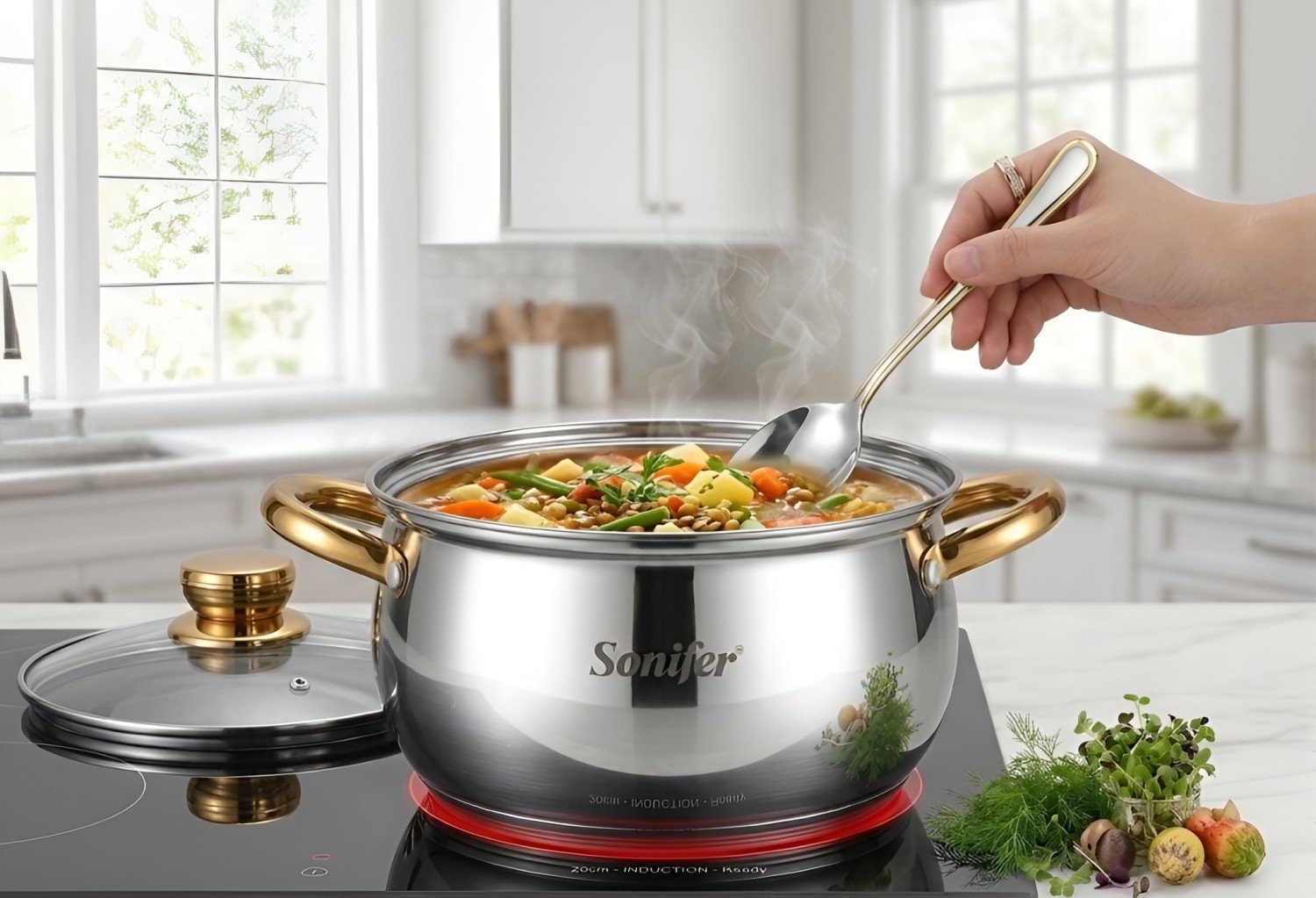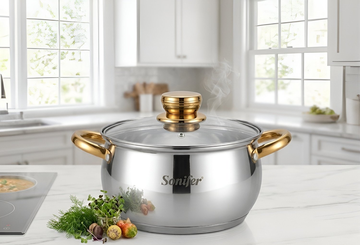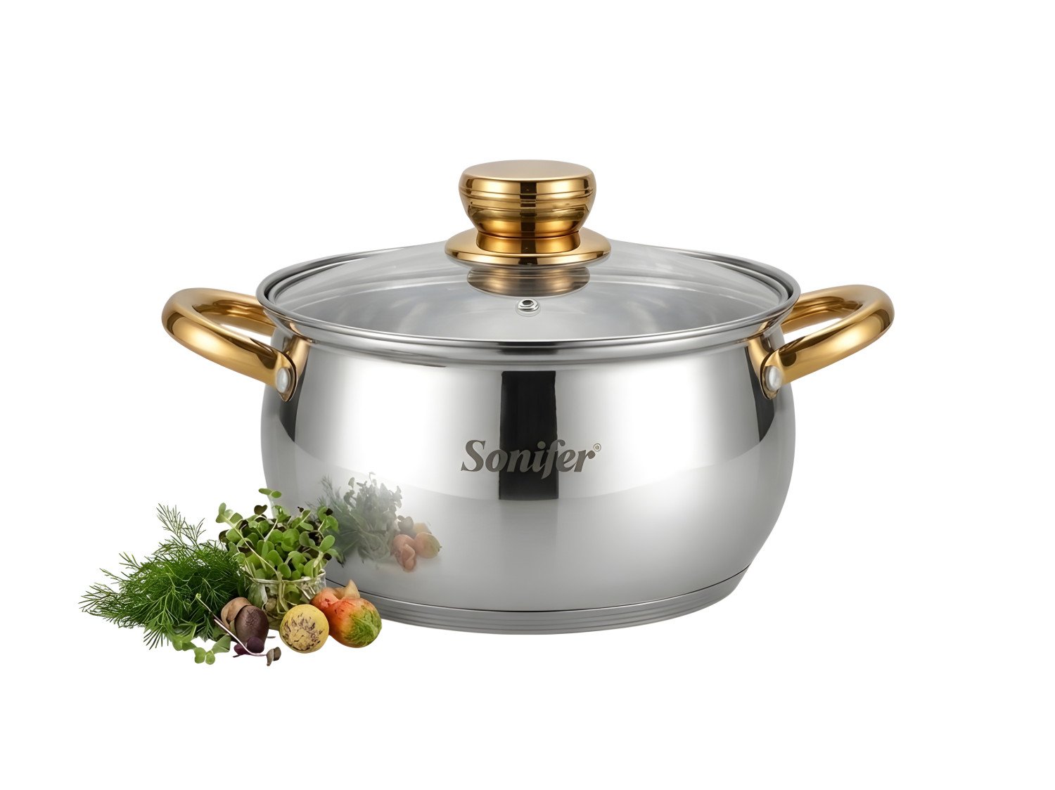 Elevate your culinary experience with this premium Sonifer stainless steel casserole. Combining professional performance with a touch of luxury, this 20cm pot features elegant gold-toned handles and a matching lid knob, making it a functional masterpiece for any modern kitchen.