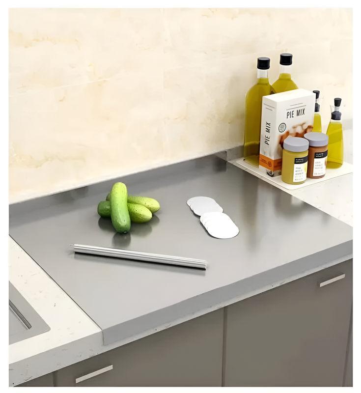 Elevate the hygiene and aesthetics of your kitchen with this Premium Stainless Steel Cutting Board. Its innovative design features an L-shaped lip that securely hooks over the edge of your counter, ensuring the board stays in place during heavy chopping or kneading. Its polished finish not only gives it a modern look but also makes it incredibly easy to clean and sanitize, making it the perfect choice for preparing meats, vegetables, and pastries.