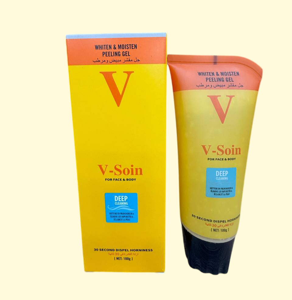 Enjoy a professional skin renewal at home with V-Soin Whiten and Moisten Peeling Gel. This formula is designed to eliminate dead skin cells and impurities, giving your skin a smooth texture and a radiant look. Thanks to its specialized formula for both face and body, this product combines deep cleansing and intense hydration at the same time.