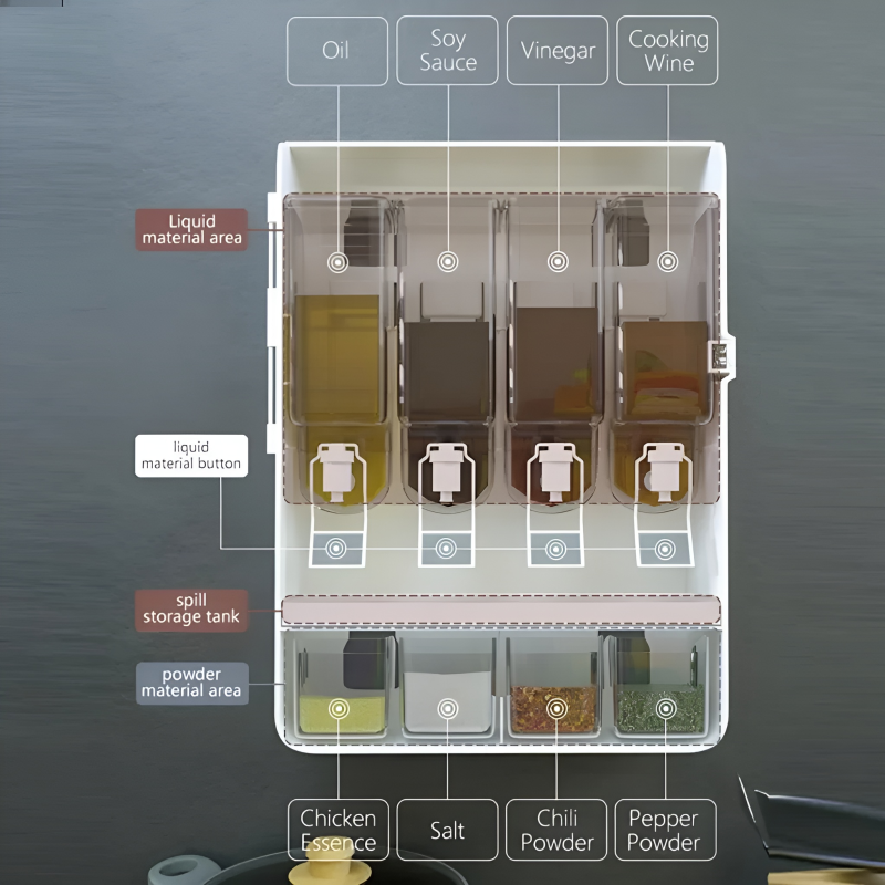 This organizer is the ultimate solution for a modern, efficient kitchen. It eliminates messy bottles, prevents drips, and combines both liquid and dry storage into one elegant, professional-looking unit.