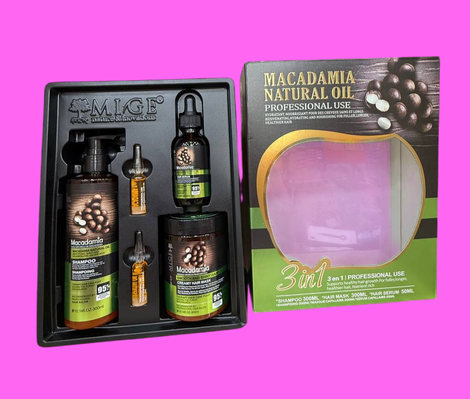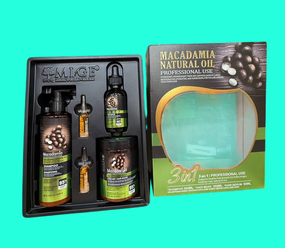 Experience the ultimate salon-quality treatment at home with this comprehensive 3-in-1 Macadamia Natural Oil set. This professional-grade collection is specifically formulated to rescue dry and damaged hair by providing intense hydration and essential nutrients. Enriched with 95% natural ingredients, it works from root to tip to restore your hair's natural vitality and promote healthy, fuller growth.
