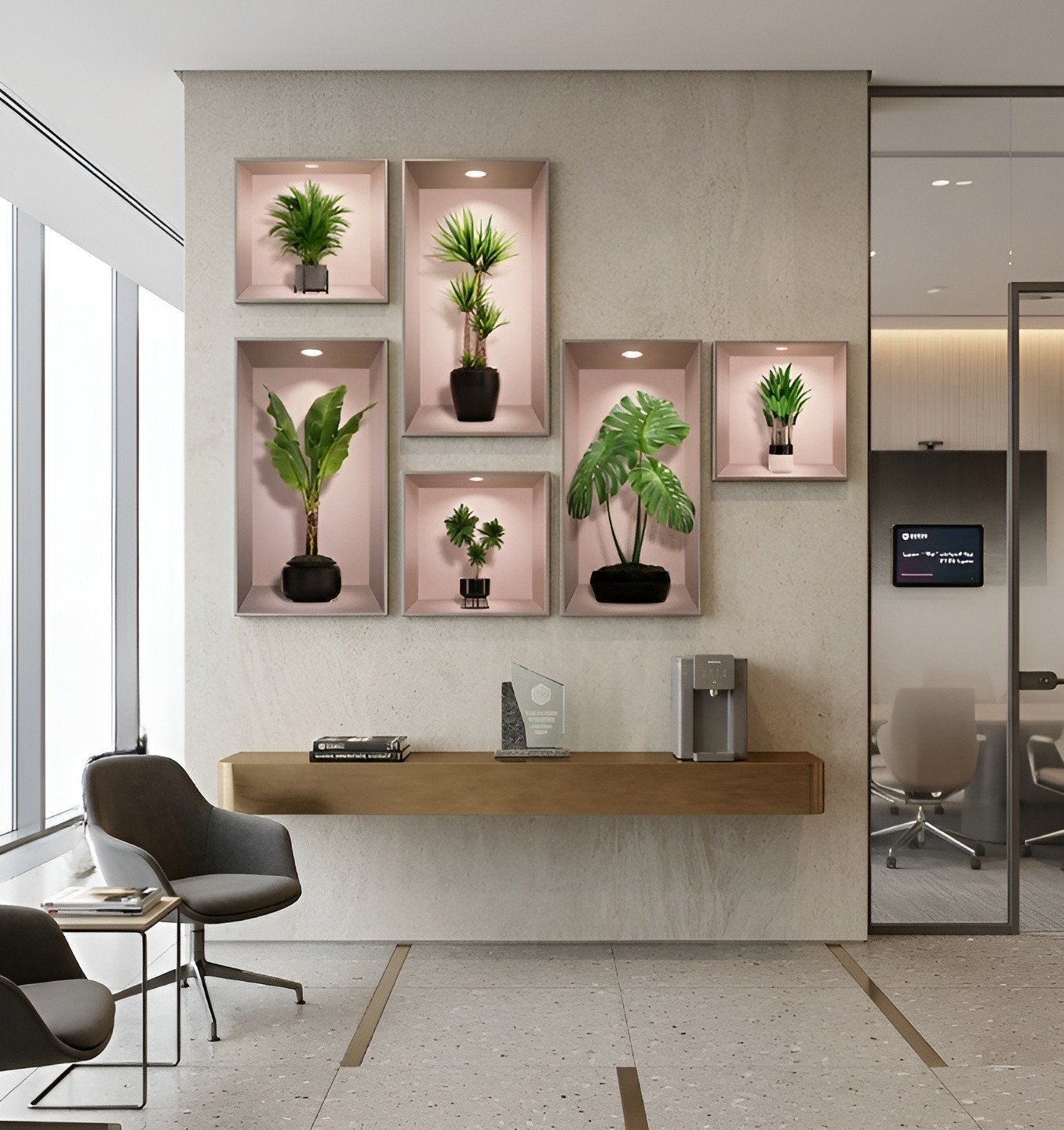 Transform your living space with these innovative 3D plant wall stickers. Designed to create a stunning visual illusion, these decals mimic the appearance of recessed wall niches with built-in spotlights, showcasing vibrant indoor plants. It is the perfect way to add a touch of nature and architectural depth to any room without the need for actual renovations or plant maintenance.