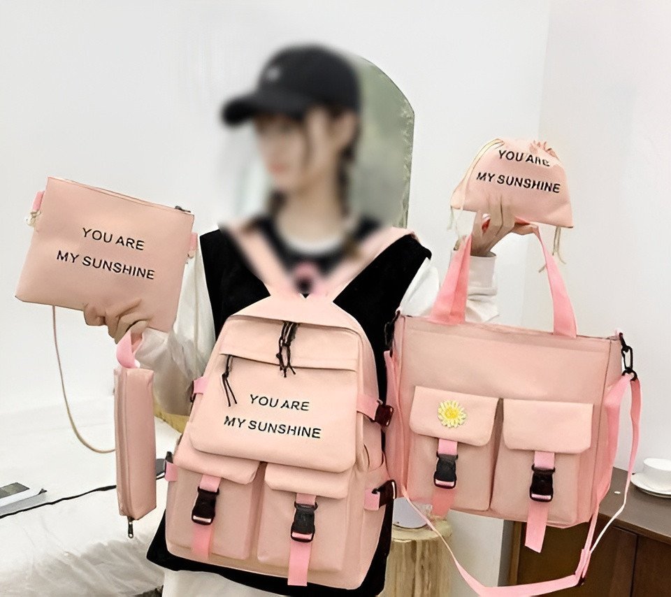 Upgrade your school style with this all-in-one 5-piece backpack set designed for the modern student. This set combines functionality with a trendy aesthetic featuring the inspiring "You Are My Sunshine" slogan. Crafted from high-quality canvas, it provides a complete solution for carrying everything from heavy textbooks to small stationery items in a coordinated and stylish way.
