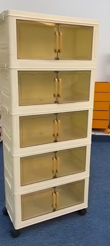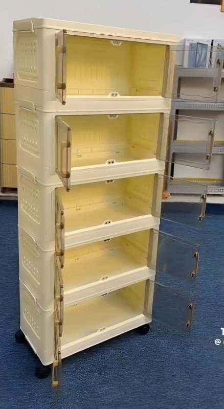 Streamline your living space with this versatile 5-tier foldable storage organizer. Designed for maximum efficiency, this stackable cabinet offers a sleek solution for clutter in any room. Its transparent doors allow for quick identification of contents, while the integrated wheels provide effortless mobility, making it an essential addition to modern homes seeking flexible storage.