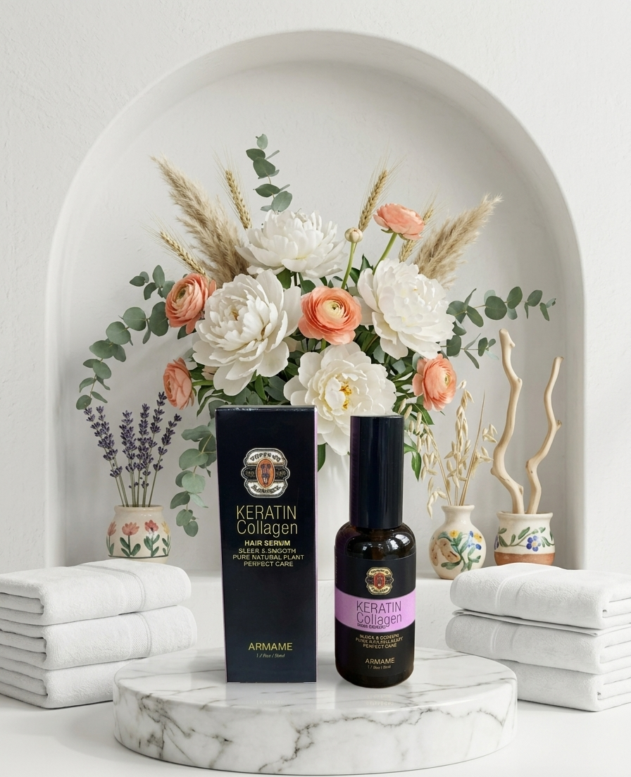 Experience the ultimate transformation for your hair with ARMAME Keratin Collagen Serum. This professional-grade formula is specifically designed to provide intensive care, turning dry and frizzy strands into a silky, sleek masterpiece. Infused with natural plant extracts, it offers a lightweight yet powerful solution for daily hair management.