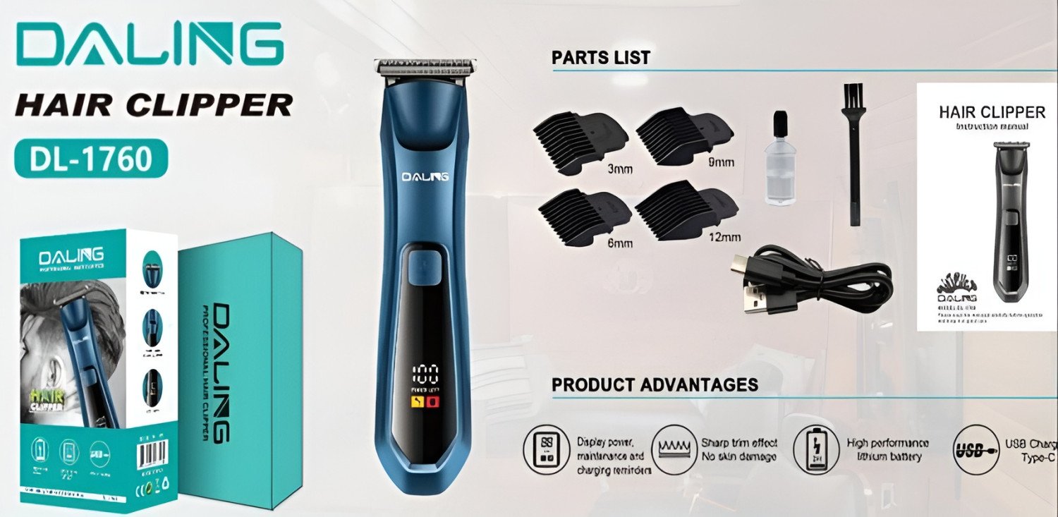 Master your look with the DALING DL-1762 Professional Hair Clipper. This sleek, metallic-finished trimmer is engineered for ultimate precision, featuring high-quality blades that provide a sharp trim without irritating the skin. Equipped with a smart LED display and a high-performance lithium battery, it offers professional barber-grade reliability in the palm of your hand.