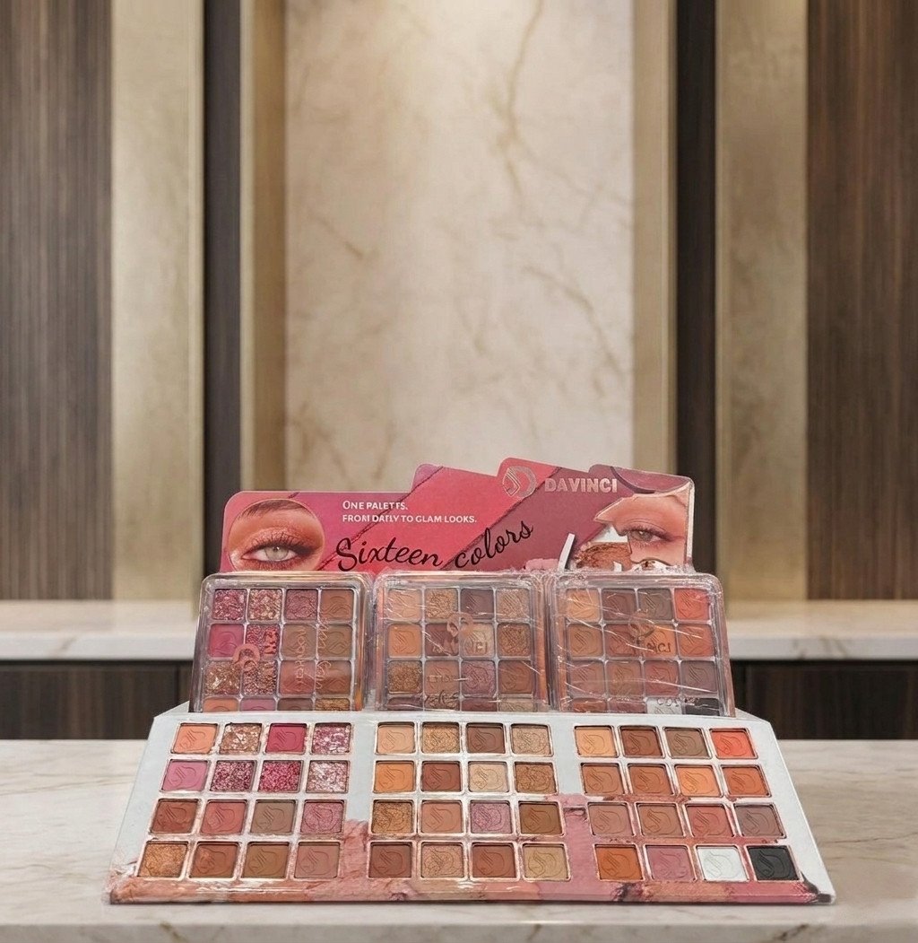 Elevate your beauty routine with the Davinci Sixteen Colors Palette collection. This premium set features three distinct palettes designed to take you from a subtle daily glow to a full high-fashion glam look. Whether you prefer romantic pinks, classic earthy tones, or bold warm oranges, this collection provides the perfect shades for every occasion and skin tone.
