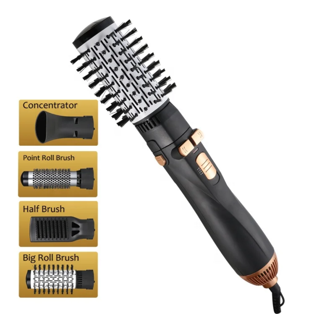 Versatile 4-in-1 Attachments: Includes four specialized heads: a large rotating volumizing brush, a thermal smoothing brush, a straightening comb, and a drying nozzle for a complete styling routine.
