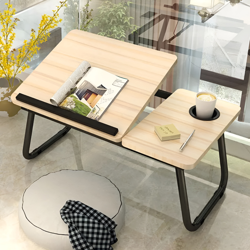 Work or study in ultimate comfort with this Ergonomic Folding Laptop Desk. Perfectly designed for use on the bed, sofa, or floor, this desk features a high-quality wood-grain surface and a sturdy metal frame. The innovative tilting section allows you to adjust the angle of your laptop or book to reduce neck and eye strain, while the built-in anti-slip stopper keeps your devices secure. With its space-saving foldable legs and integrated cup holder, it provides a professional and organized workspace wherever you choose to sit.