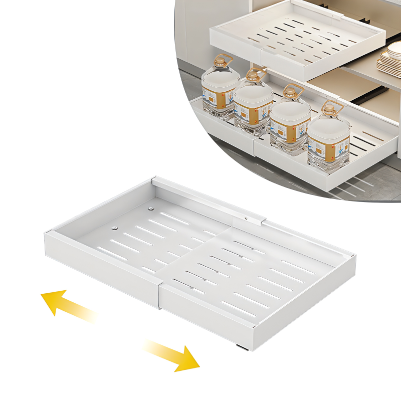 Transform your cluttered cabinets into a perfectly organized space with this Expandable Pull-Out Cabinet Organizer. Designed for maximum accessibility, this slide-out drawer allows you to reach items tucked away in the back of your pantry or kitchen cabinets with a simple smooth glide, eliminating the need to dig through piles of cookware or jars.