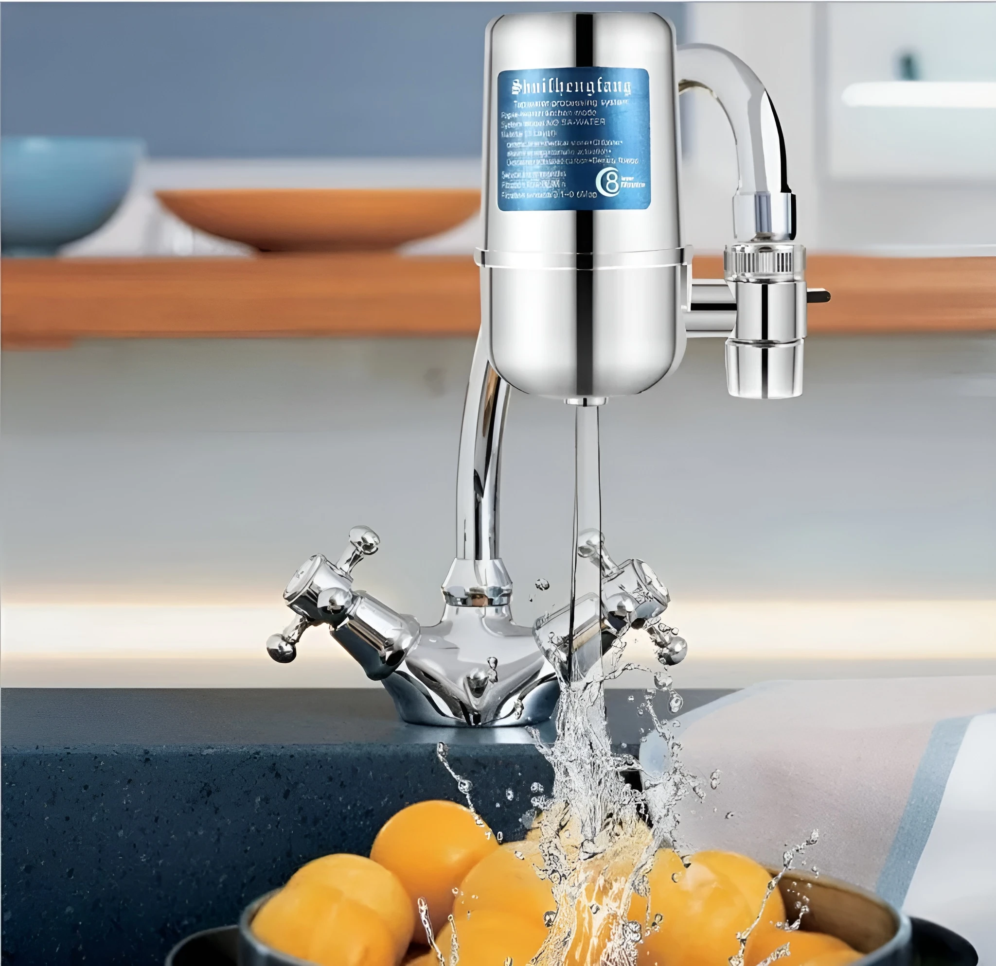 Upgrade your kitchen hygiene with this advanced 8-layer faucet water purifier. Designed to fit directly onto your existing tap, this device transforms ordinary tap water into clean, safe, and great-tasting water for drinking and cooking. Its sleek chrome finish ensures it complements your kitchen decor while providing essential health protection for your family.