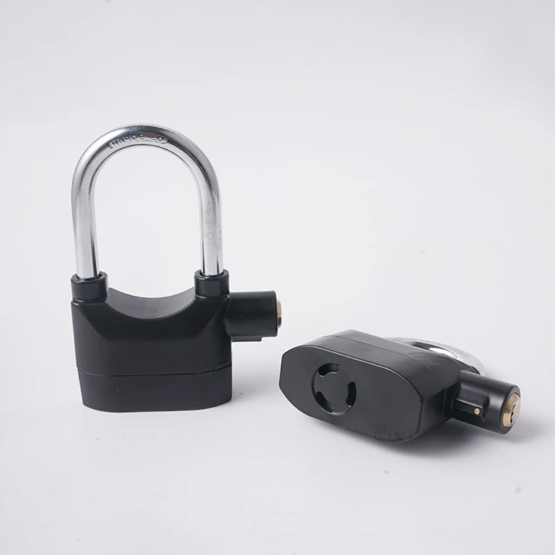 Secure your valuable assets with this heavy-duty siren alarm padlock. Designed to provide a high level of security, this lock features a dual-function system that works as a traditional high-security padlock or as a loud 110dB siren alarm that triggers upon vibration or movement. It is the perfect deterrent for thieves, making it ideal for motorcycles, bicycles, gates, and storage units.
