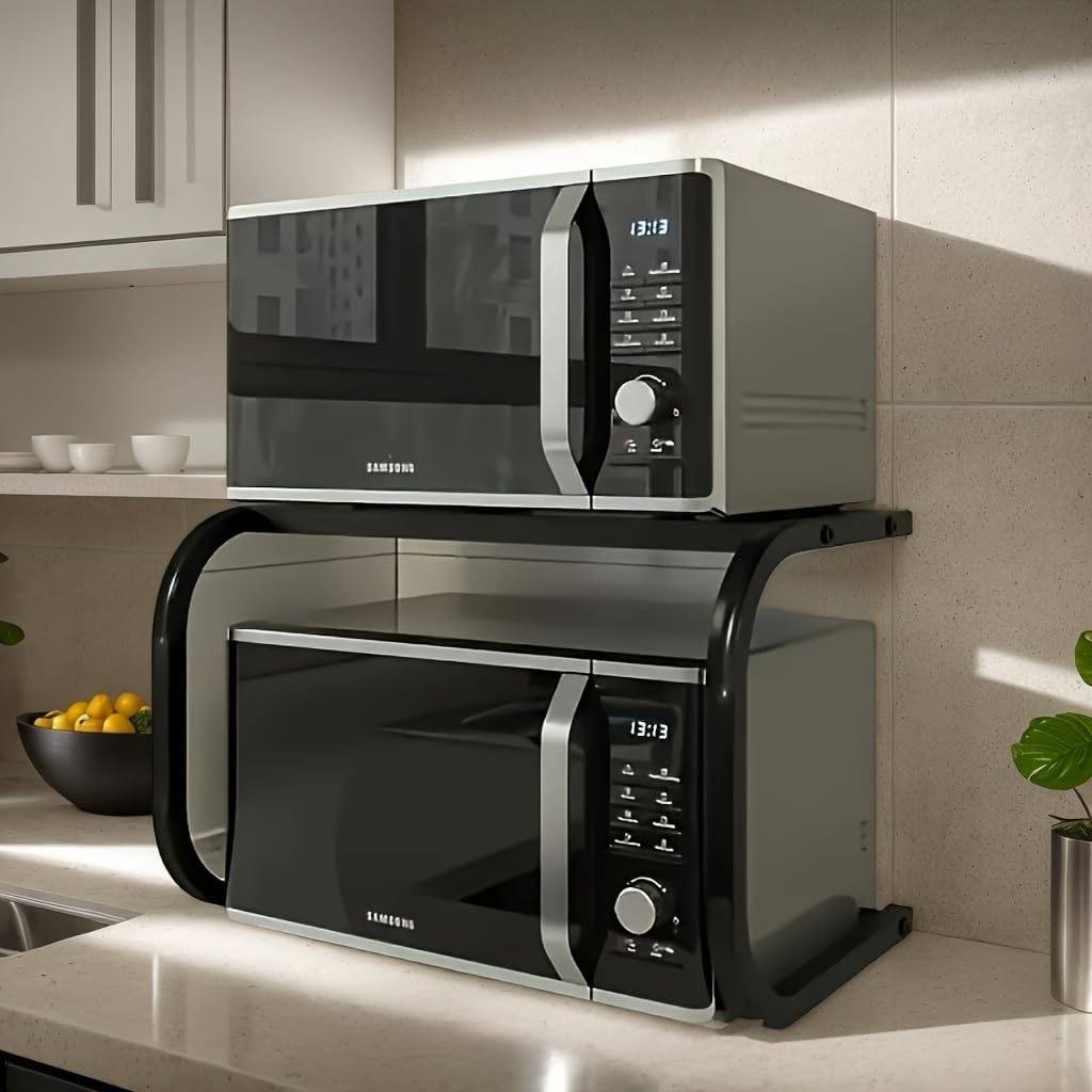 This microwave rack is the ultimate solution for small kitchens or for anyone looking to optimize their countertop organization. Unlike standard shelves, its specialized design for heat dissipation makes it safe for use over appliances. It is a durable, stylish, and practical tool that doubles your storage capacity instantly.