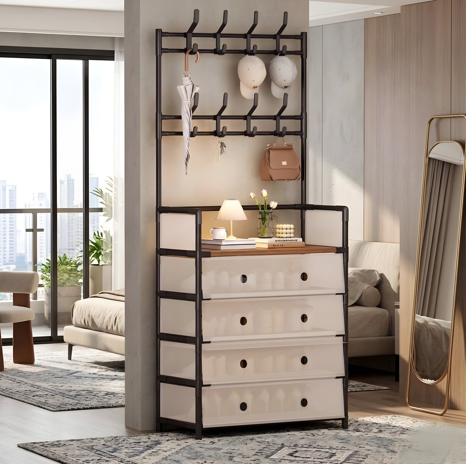 The Integrated 4-Tier Shoe Cabinet and Clothing Organizer for Space Saving is the ultimate organization tool for modern living. It eliminates the daily stress of searching for lost keys or tripping over scattered shoes by gathering all your exit essentials into one stylish unit. It is an investment in your home's efficiency that keeps your private space looking organized and beautiful.
