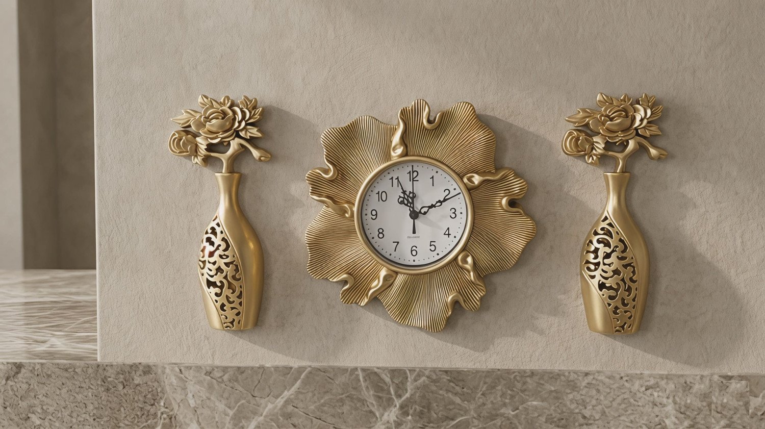 Transform your living space into a gallery of elegance with this exquisite three-piece golden wall decor set. This set features a stunning artistic wall clock flanked by two matching decorative wall-mounted vases, all finished in a brilliant gold that radiates luxury. Designed for those who appreciate fine details, this ensemble serves as both a functional timepiece and a sophisticated art installation for any modern or classic home.