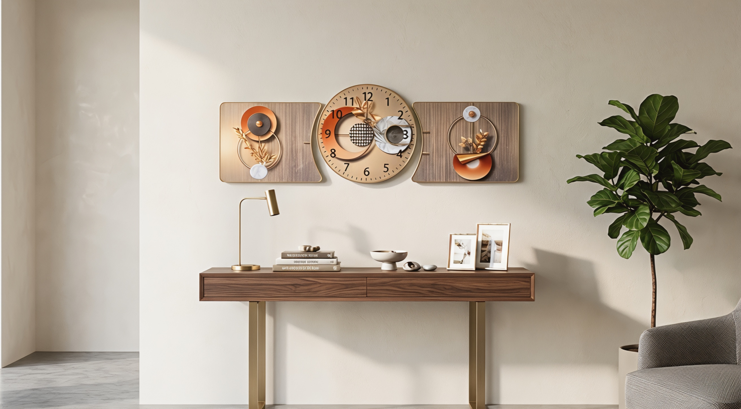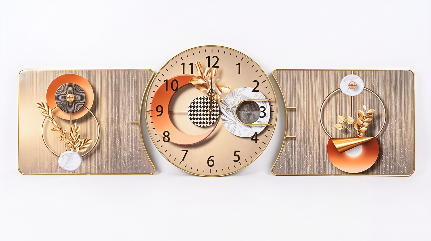 Elevate your interior aesthetics with this stunning 3-piece decorative wall clock set. This masterpiece seamlessly blends functional timekeeping with contemporary abstract art. Designed to be the focal point of any room, it features a central circular clock flanked by two matching artistic panels, creating a cohesive and luxurious look that covers a wide wall area.