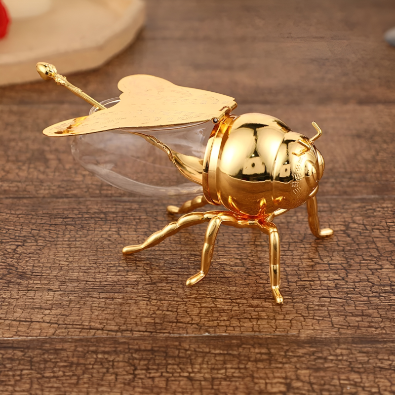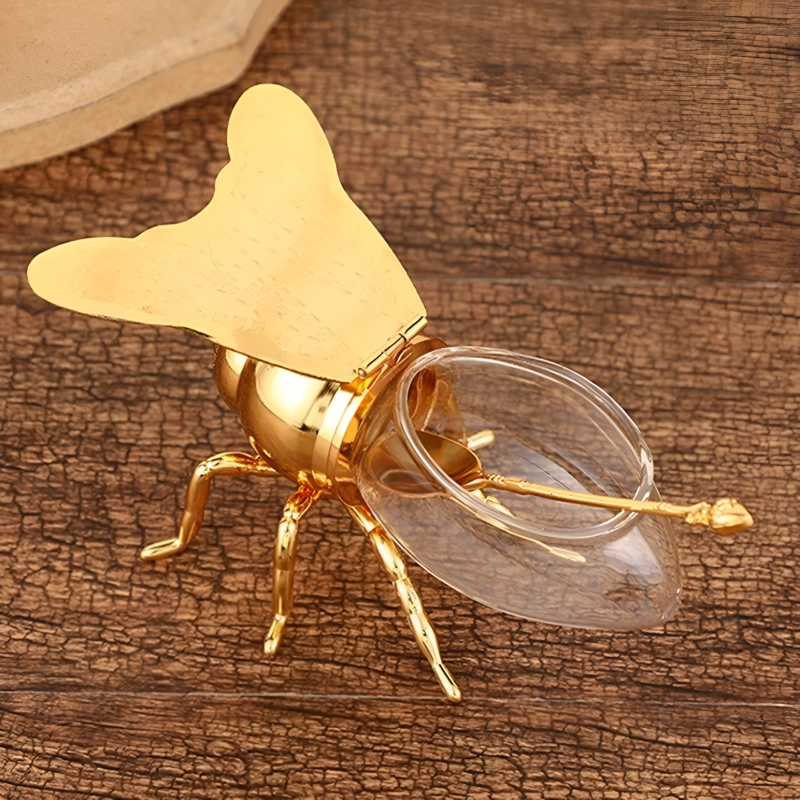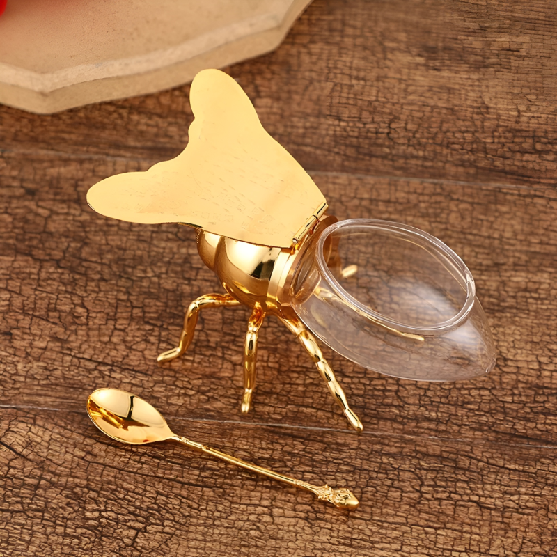This luxury bee-shaped jar is a specialized piece of tableware designed for serving spices and condiments with elegance. The metallic body is crafted with high-quality gold plating, featuring detailed wings that function as a hinged lid to protect the contents. It serves as a sophisticated addition to dining settings, combining artistic craftsmanship with practical kitchen utility.