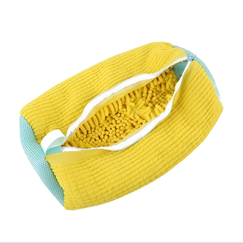 This innovative shoe washing bag provides a hassle-free solution for keeping footwear spotless. The interior is lined with dense chenille fibers that act as hundreds of tiny brushes, scrubbing away dirt and stains during the wash cycle. It effectively prevents shoes from rattling or causing damage to the washing machine drum, ensuring a quiet and safe cleaning process.