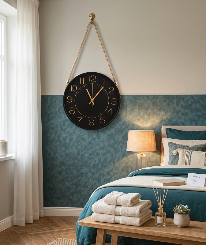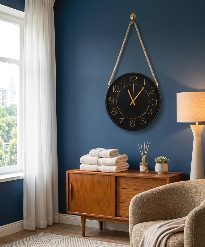 This clock is the ideal choice for those who appreciate fine details and unique textures. By blending industrial black tones with warm gold and natural fibers, it offers a timeless design that fits various decor styles. It is easy to install and provides an instant upgrade to your space without the need for complex renovations.