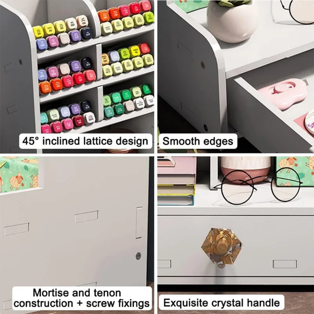 Transform your workspace into a model of efficiency and style with this Multi-Functional Wooden Desktop Organizer. This all-in-one storage solution is designed to declutter your desk by providing a dedicated home for everything from markers and pens to notebooks and smartphones. Its clever vertical design and elegant white finish make it an essential addition to any student's desk, artist's studio, or professional office, ensuring your creative tools are always within reach.