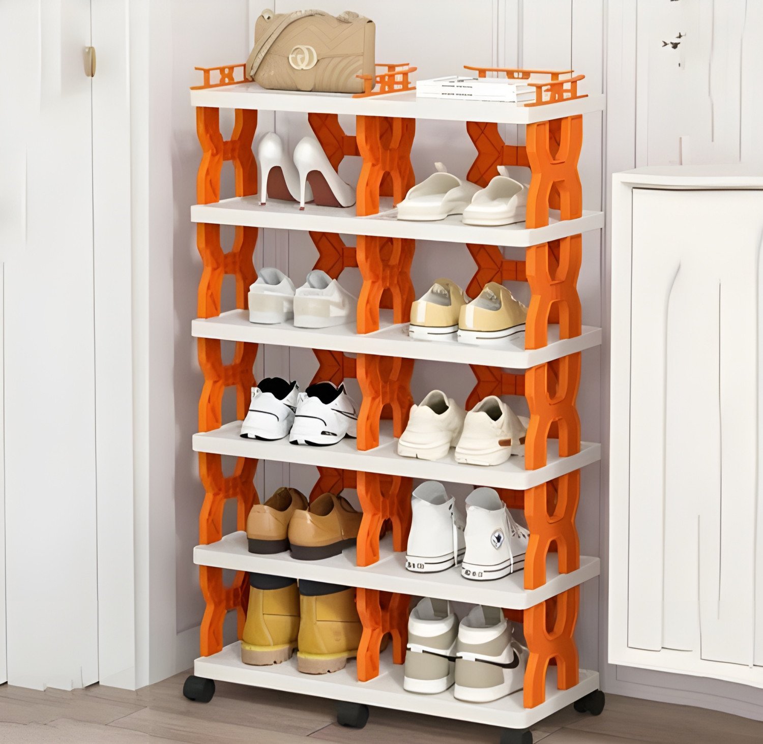Keep your footwear collection perfectly organized and easily accessible with this stylish and functional mobile shoe rack. Featuring a unique modern X-frame design in vibrant orange and clean white shelves, this rack adds a touch of contemporary flair to any room while solving your storage challenges. It is the perfect blend of aesthetic appeal and practical utility for modern homes.